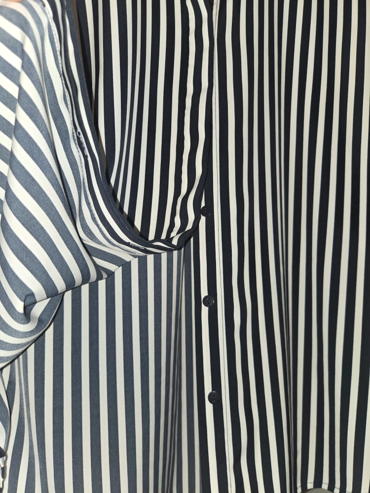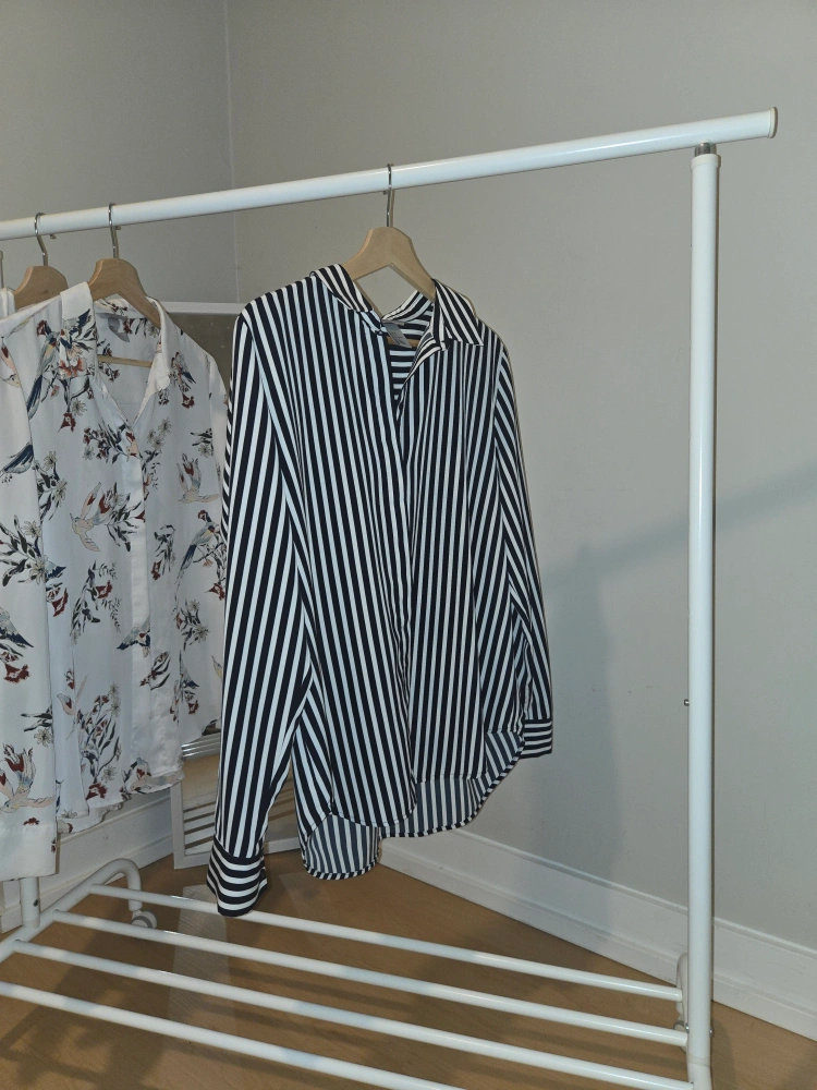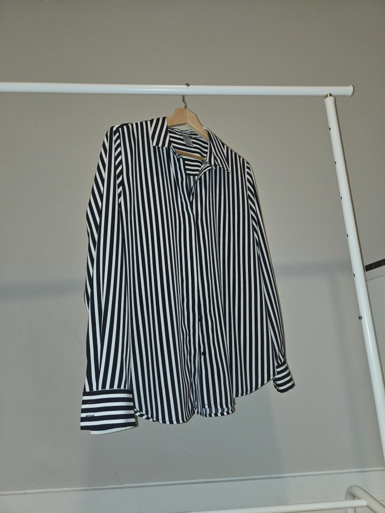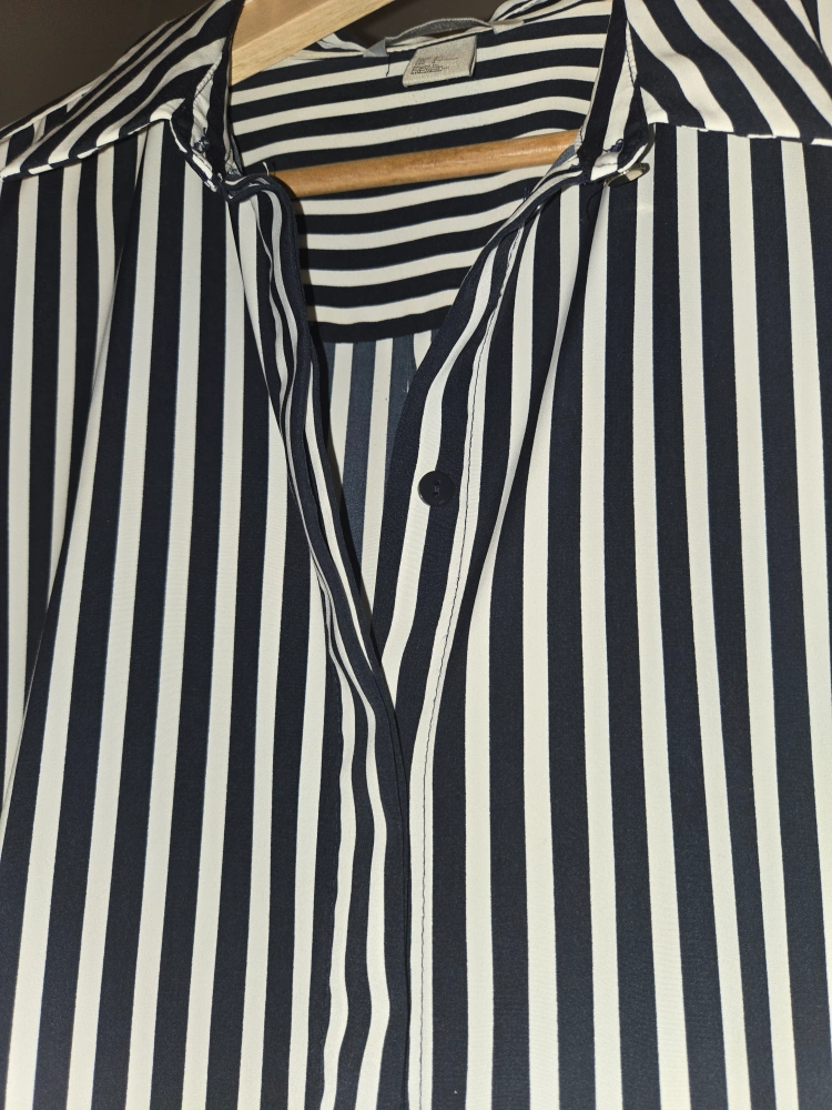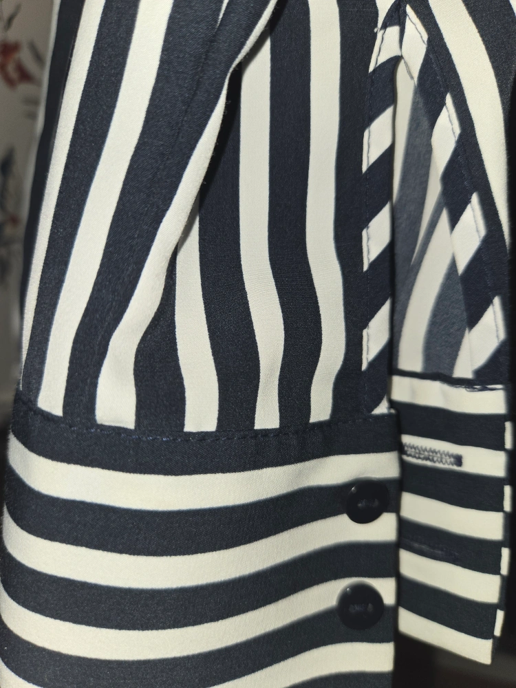 79Black and white striped long-sleeved blouse with button closure. Polyester blend, soft. Medium, regular fit. Long sleeve, double button cuffs, rounded hem.