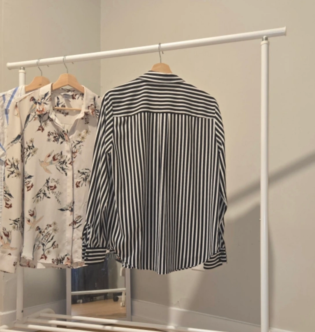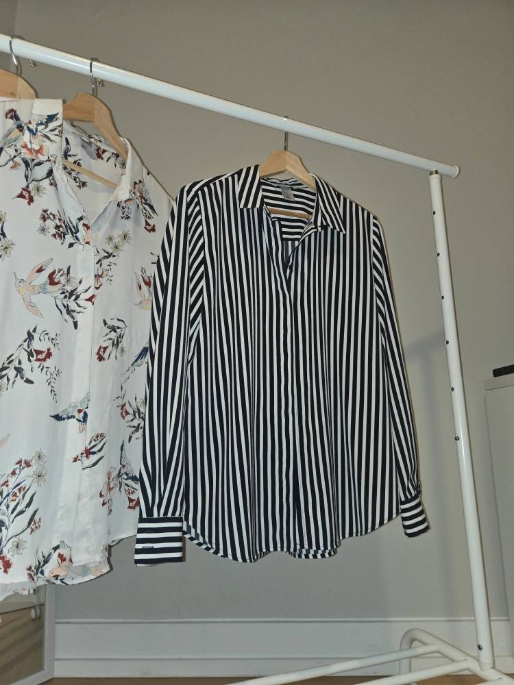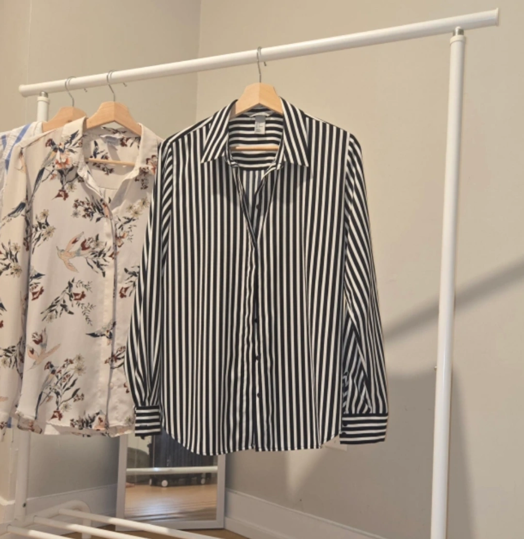 79Black and white striped long-sleeved blouse with button closure. Polyester blend, soft. Medium, regular fit. Long sleeve, double button cuffs, rounded hem.