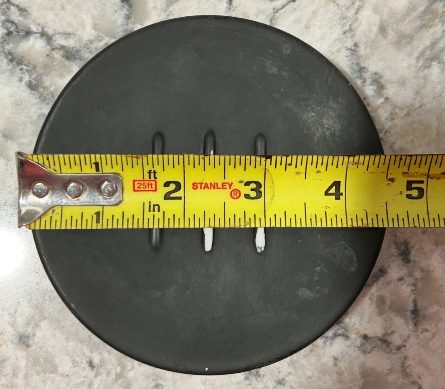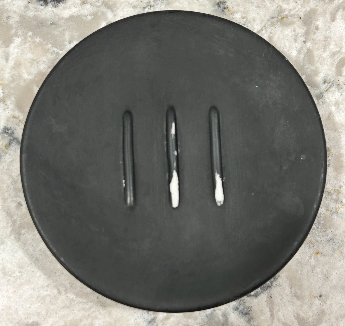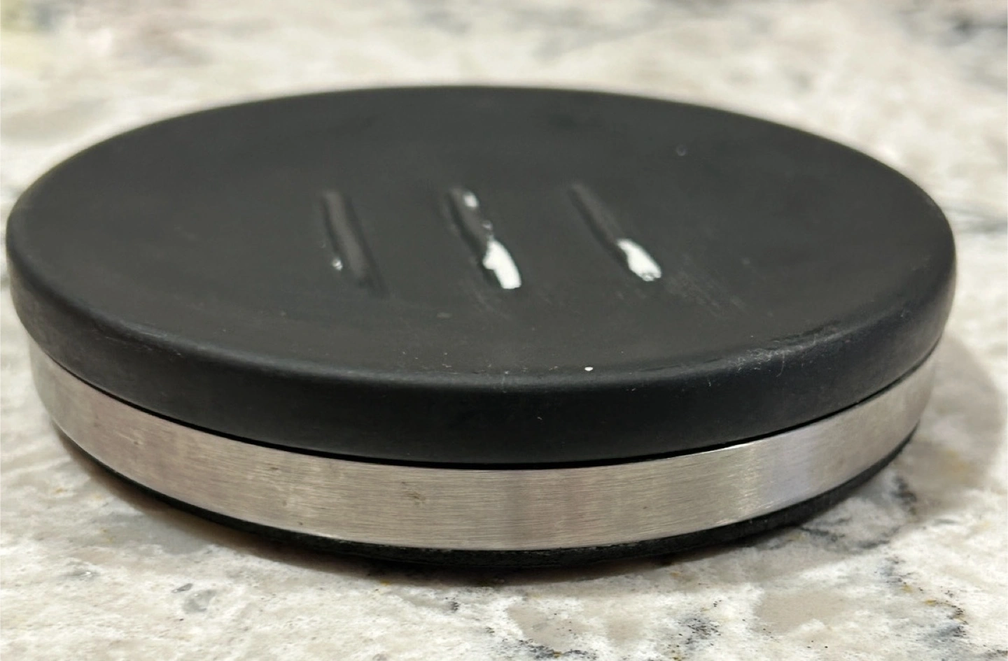 Soft Padded Bottom Stainless Steel and Ceramic Like Top Soap Dish Great condition. Bit of the paint has chipped off the top could be repainted. Bottom is padded and just has sticker residue. Could be taken off easily if wanted. Side is stainless steel and top is ceramic or material like that. See other listings for more household items