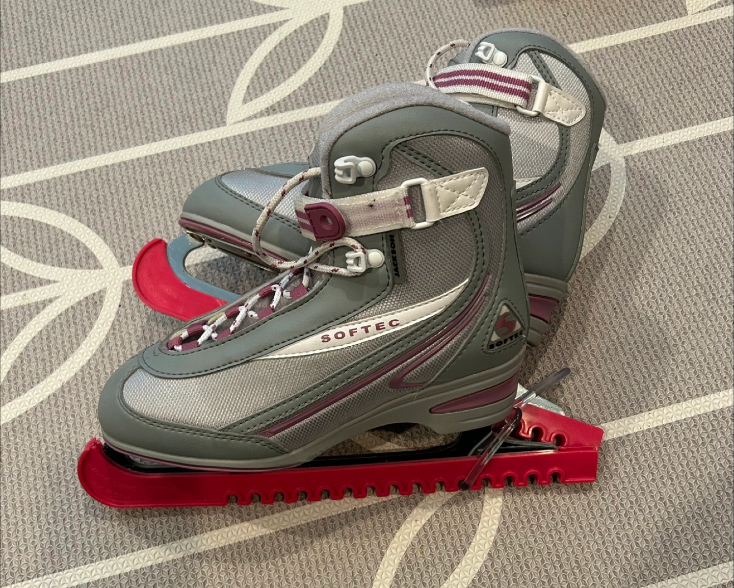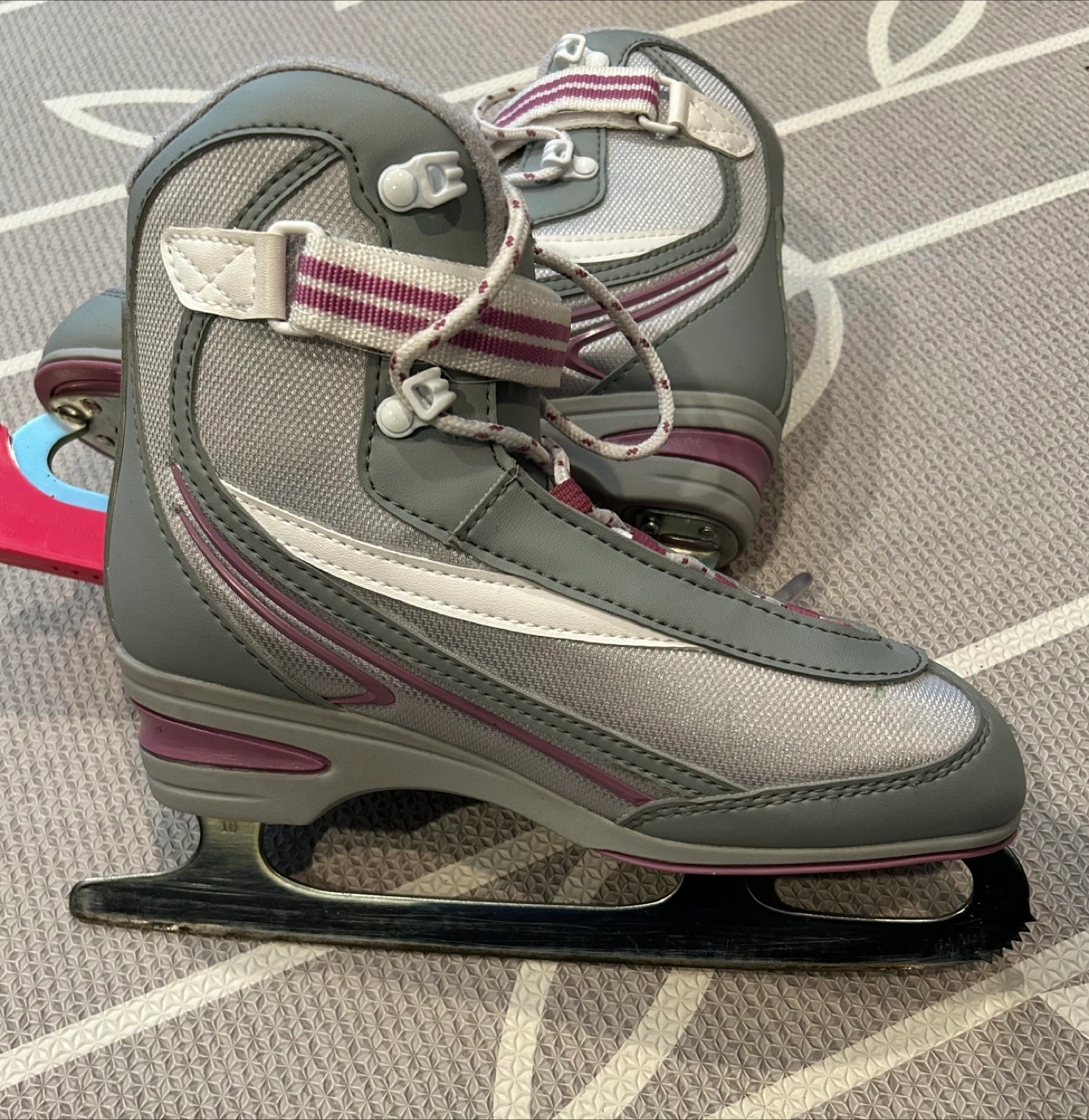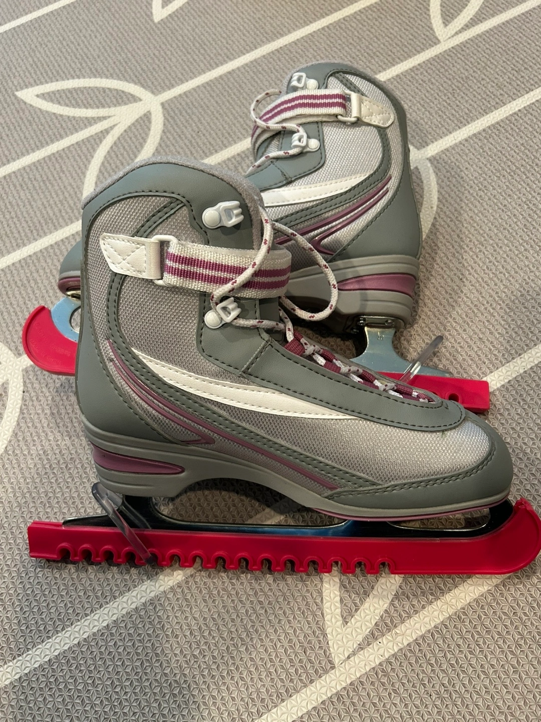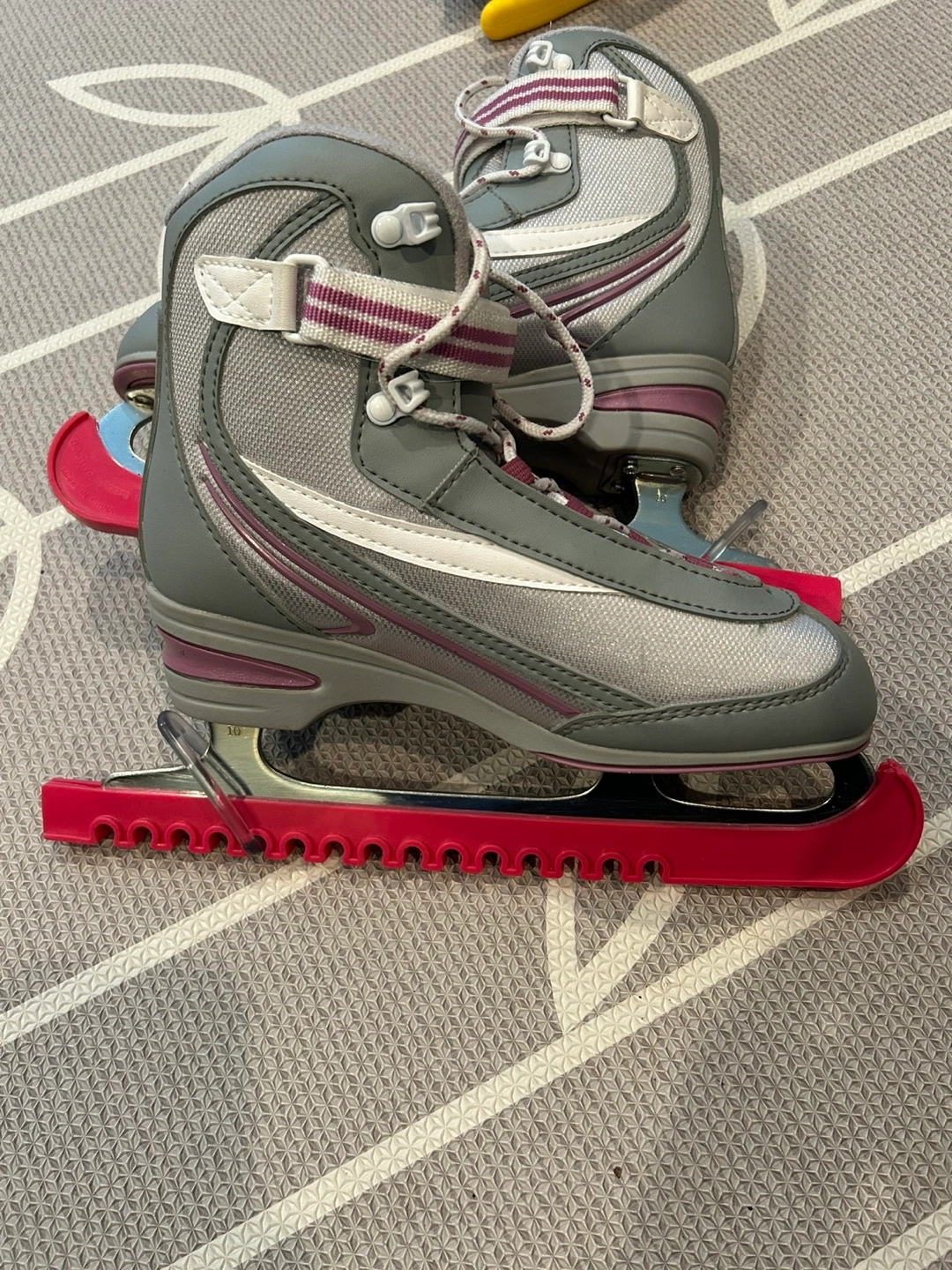 Girls' figure skates. Grey and purple. Size 8. Includes skate guards. Good condition.