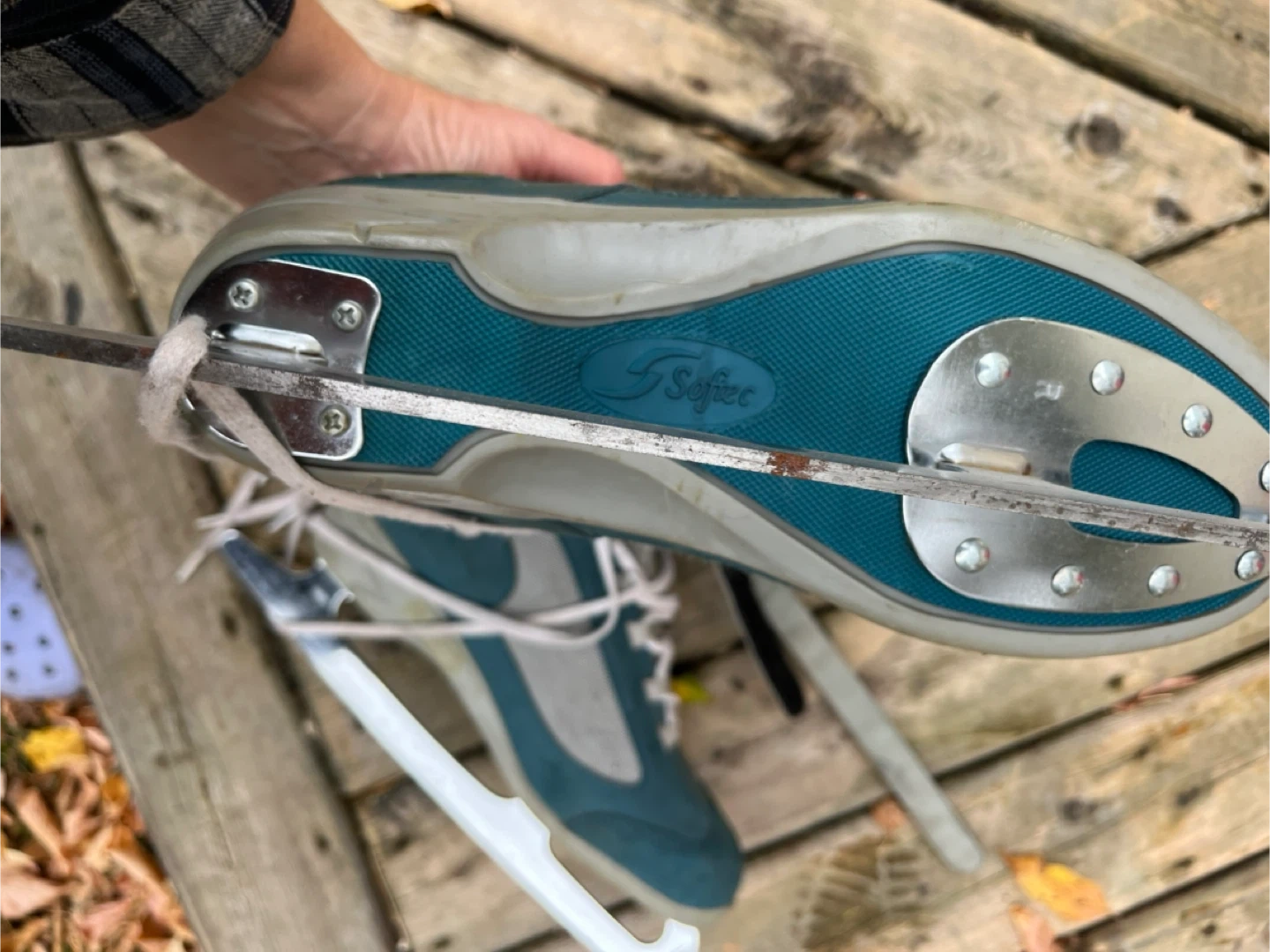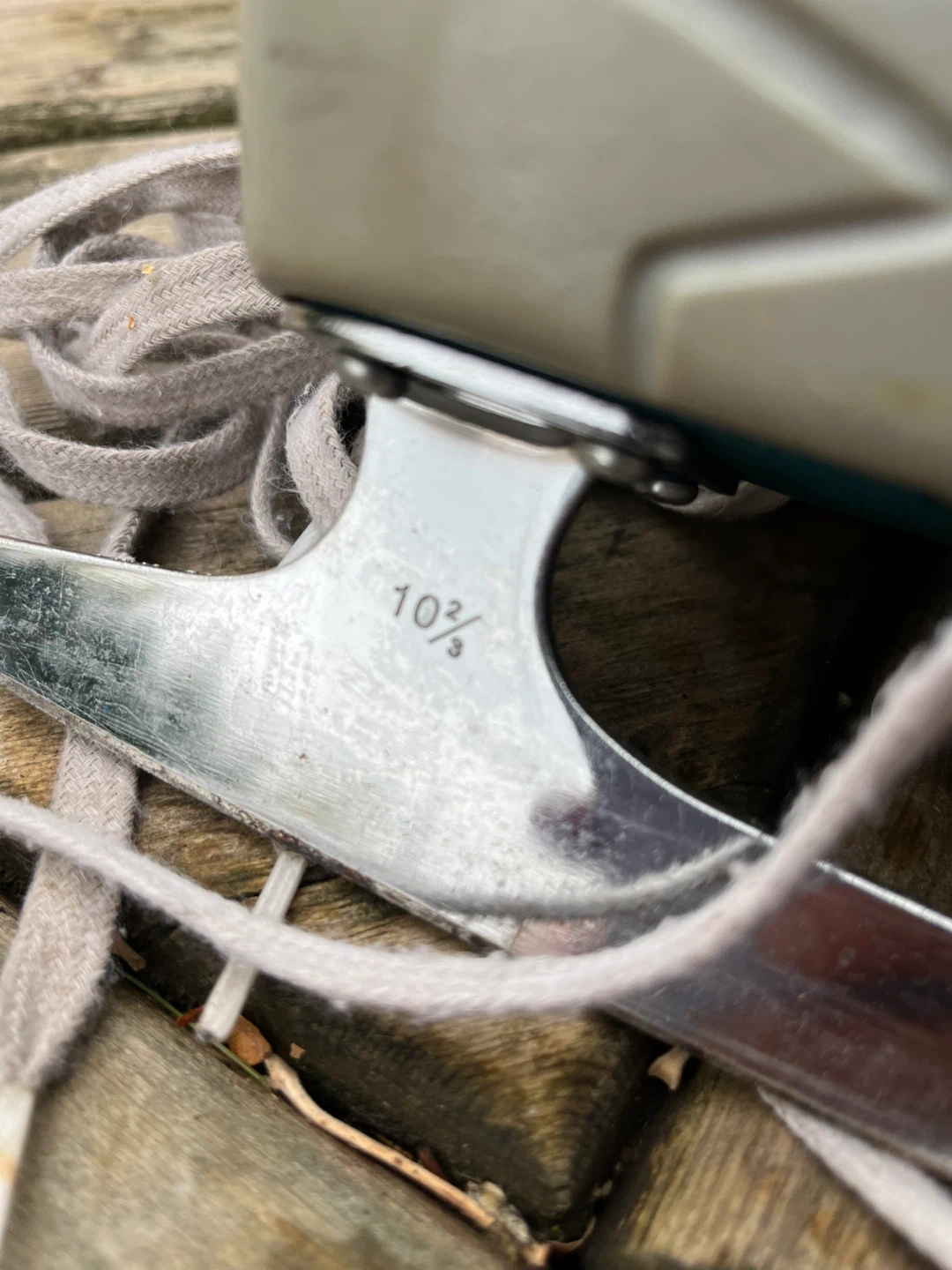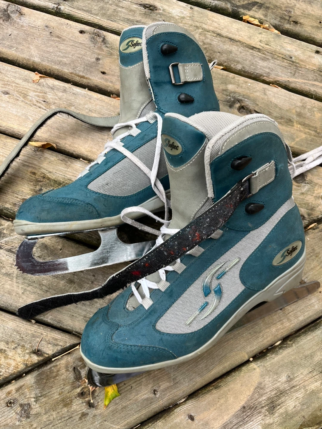 Selling a pair of Softec ice skates in size 10. They are a teal and grey colour and have some signs of wear. The blade size is 10 2/3.