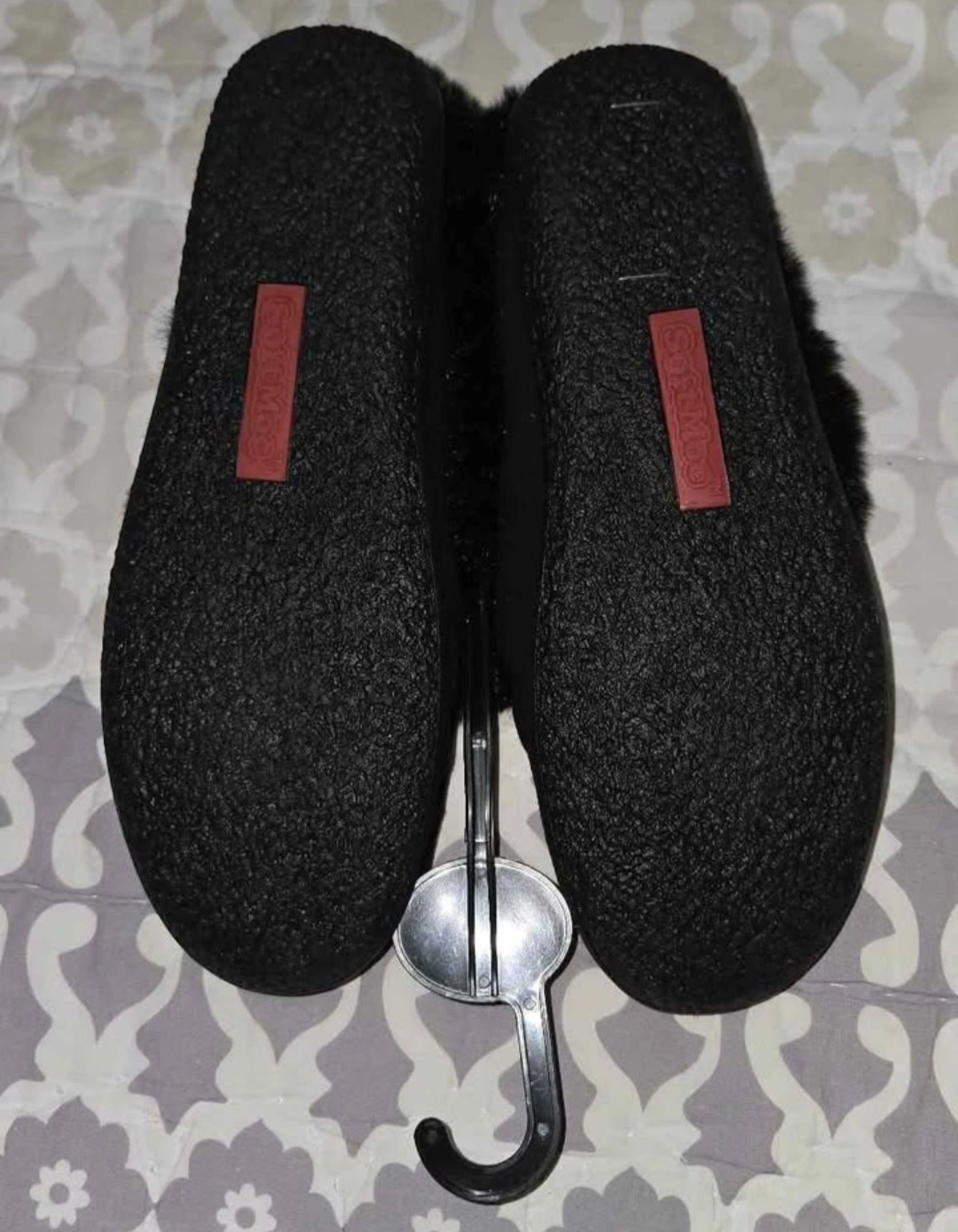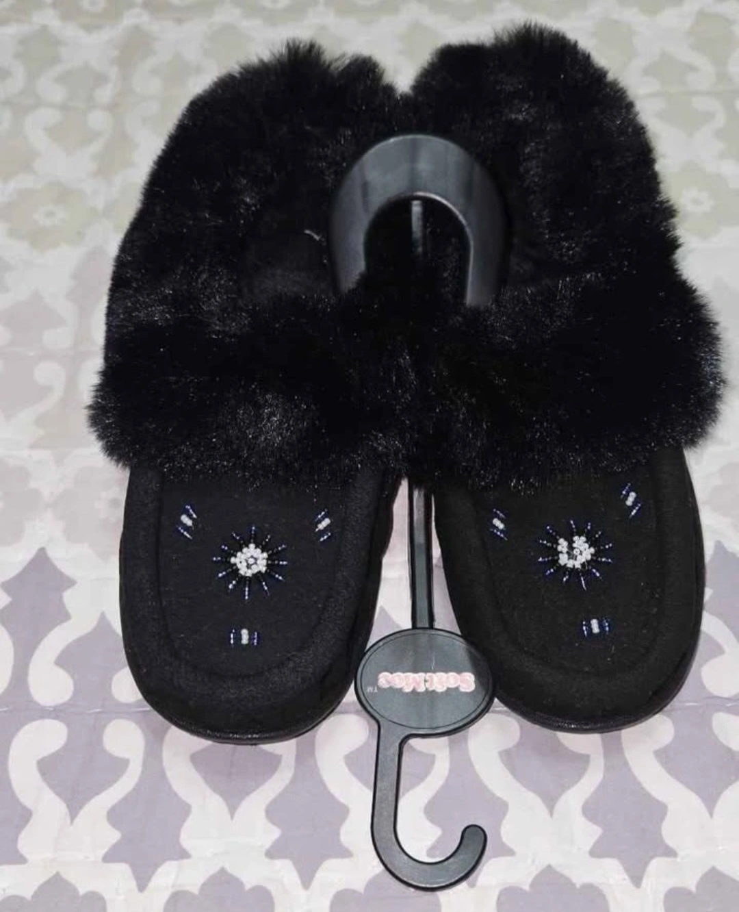 22Cozy up with these SoftMoc black moccasin They feature a soft, plush lining and beaded detailing on the front. Perfect for keeping your feet warm and comfy around the house
