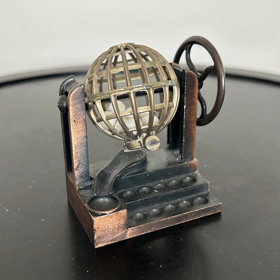 Charming vintage die-cast miniature pencil sharpener shaped like a classic Bingo/Lottery cage. Made from die-cast metal with a lovely antiqued bronze/copper-tone finish, this collectible miniature features a rotating cage wheel and decorative numbered balls. The sharpener blade is fully functional and intact on the underside. Perfect as a desk accessory, gift for a teacher, or for collectors of miniatures and novelty items. Pick up in the Seton area, Calgary. Feel free to message if you have any questions!