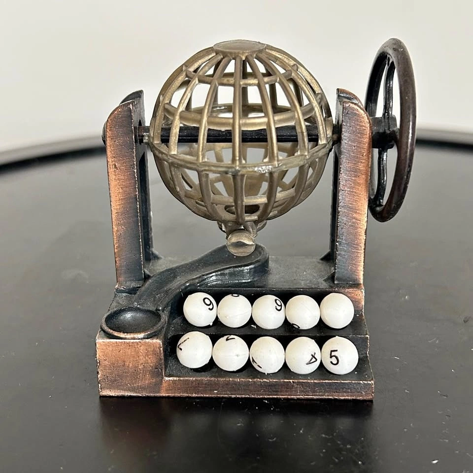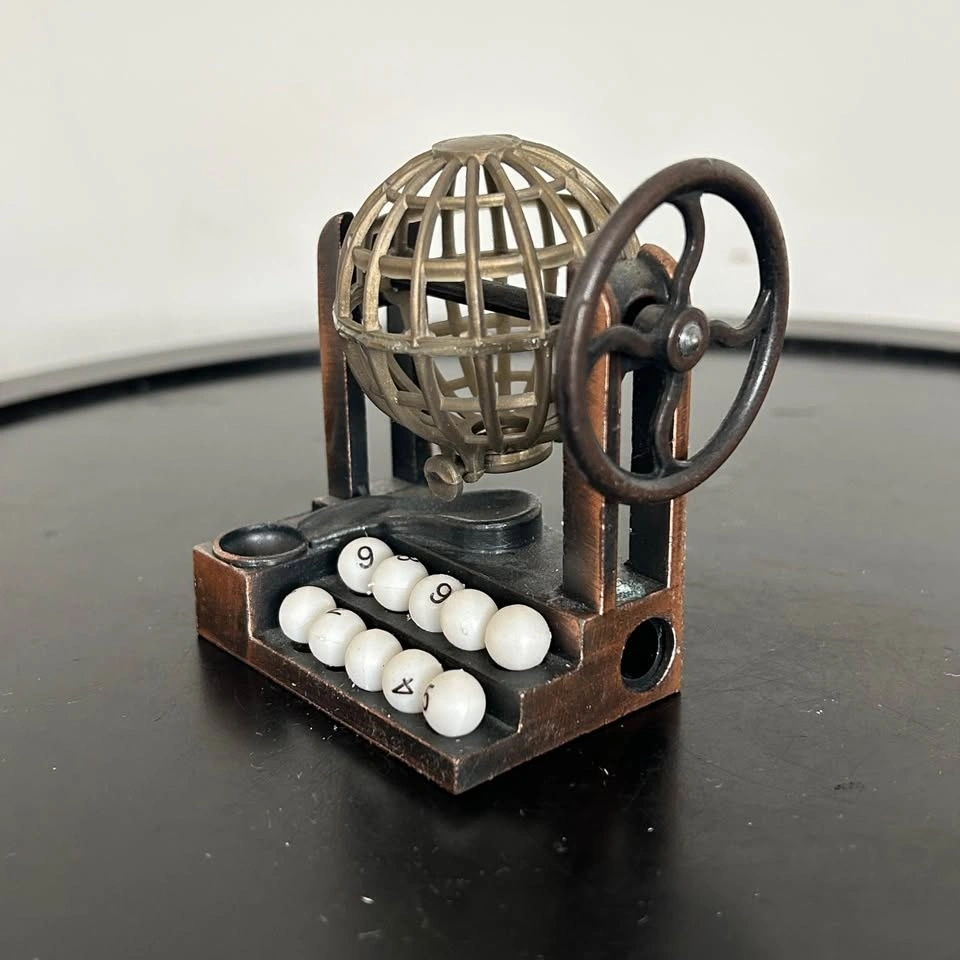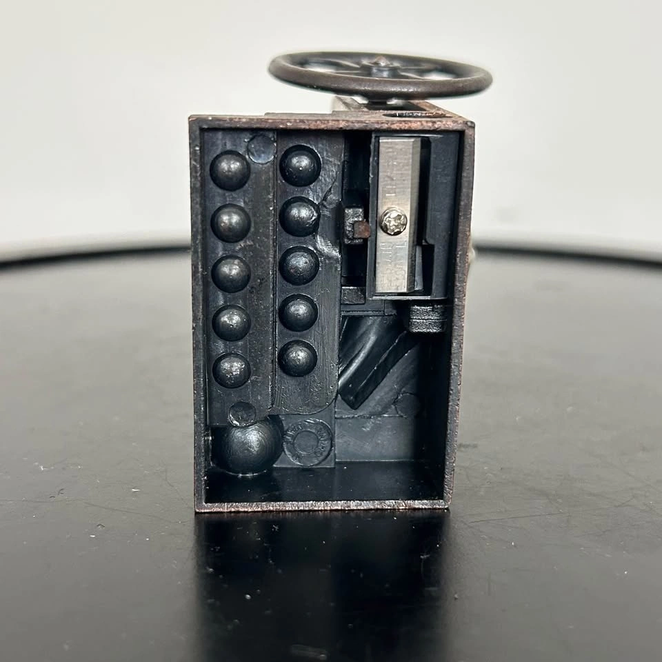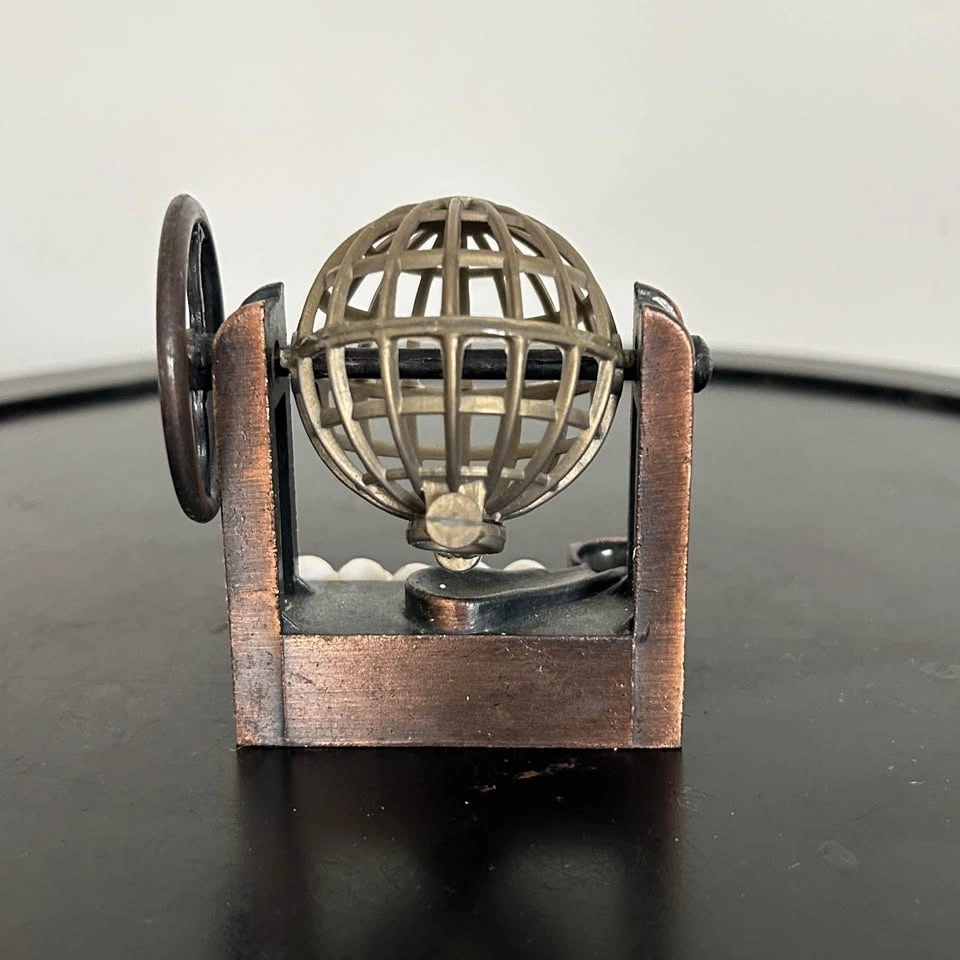 Charming vintage die-cast miniature pencil sharpener shaped like a classic Bingo/Lottery cage. Made from die-cast metal with a lovely antiqued bronze/copper-tone finish, this collectible miniature features a rotating cage wheel and decorative numbered balls. The sharpener blade is fully functional and intact on the underside. Perfect as a desk accessory, gift for a teacher, or for collectors of miniatures and novelty items. Pick up in the Seton area, Calgary. Feel free to message if you have any questions!