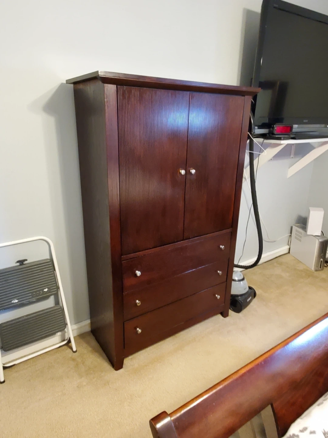 Selling complete 6 piece solid dark brown wood bedroom set up for grabs. Includes a bed frame, dresser with mirror, two nightstands, and a tall armoire. Dresser has 6 drawers. Each nightstand has 2 drawers. Armoire has 2 doors and 3 drawers. Lots of storage.