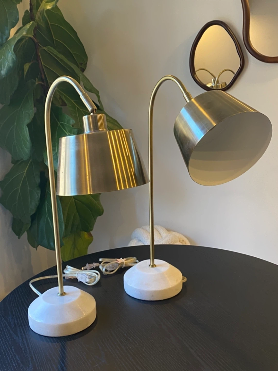 • Heavy, solid white marble bases (providing excellent stability) with a sophisticated brushed brass finish.
