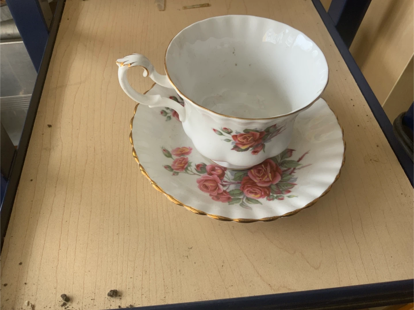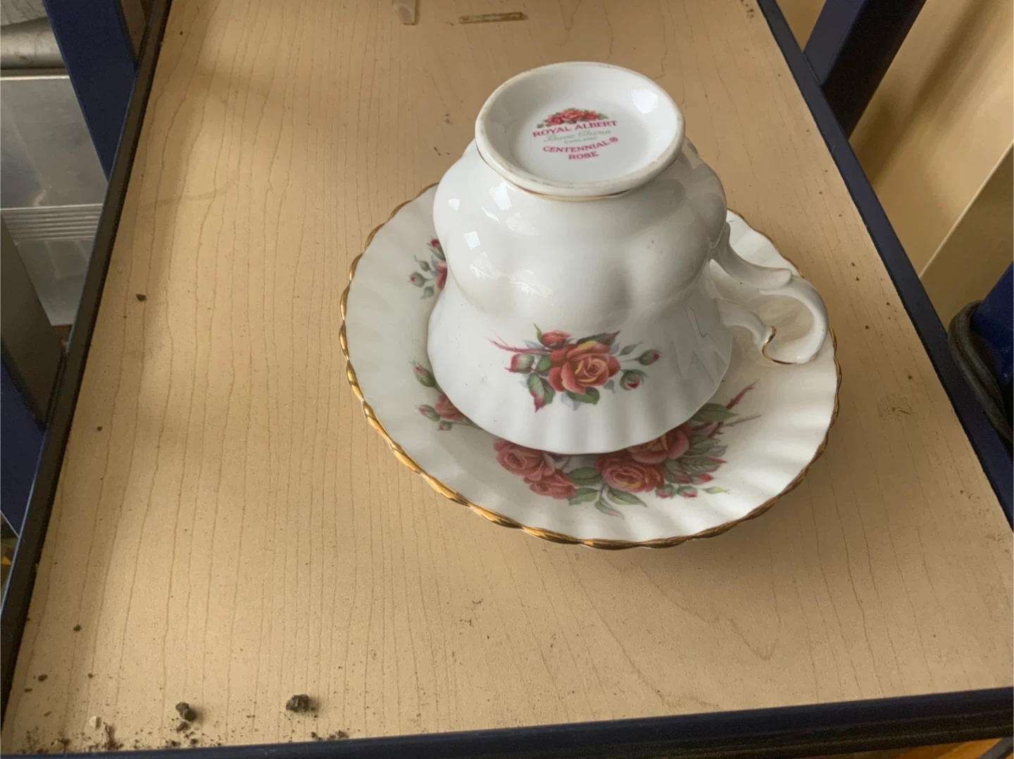 Vintage Royal Albert Centennial Rose teacup and saucer set. Features a beautiful rose floral design with gold trim. This elegant china set is perfect for enjoying your favourite tea.
