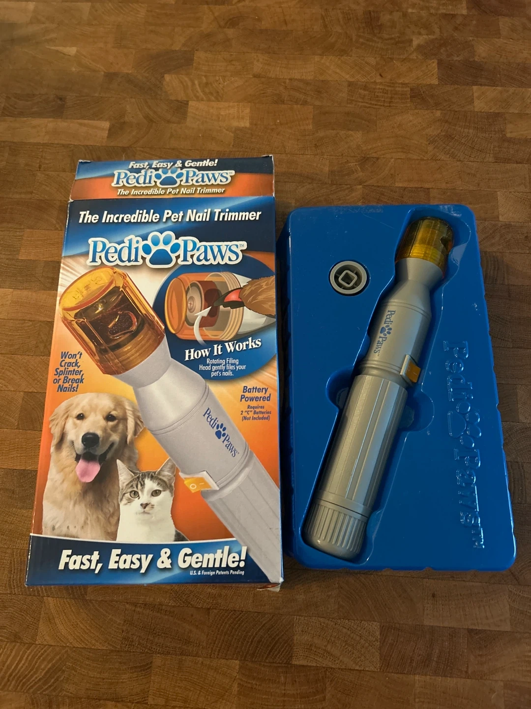 This PediPaws is the incredible pet nail trimmer. It's battery powered and requires 2 "C" batteries, not included. Won't crack, splinter, or break nails! Perfectly work no issues, my dog just doesn’t like it.