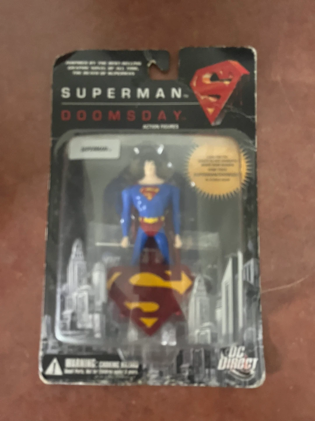 This DC Direct action figure features Superman from the Doomsday storyline. It includes a display base and is in its original packaging. This figure is a collectible for DC Comics fans.