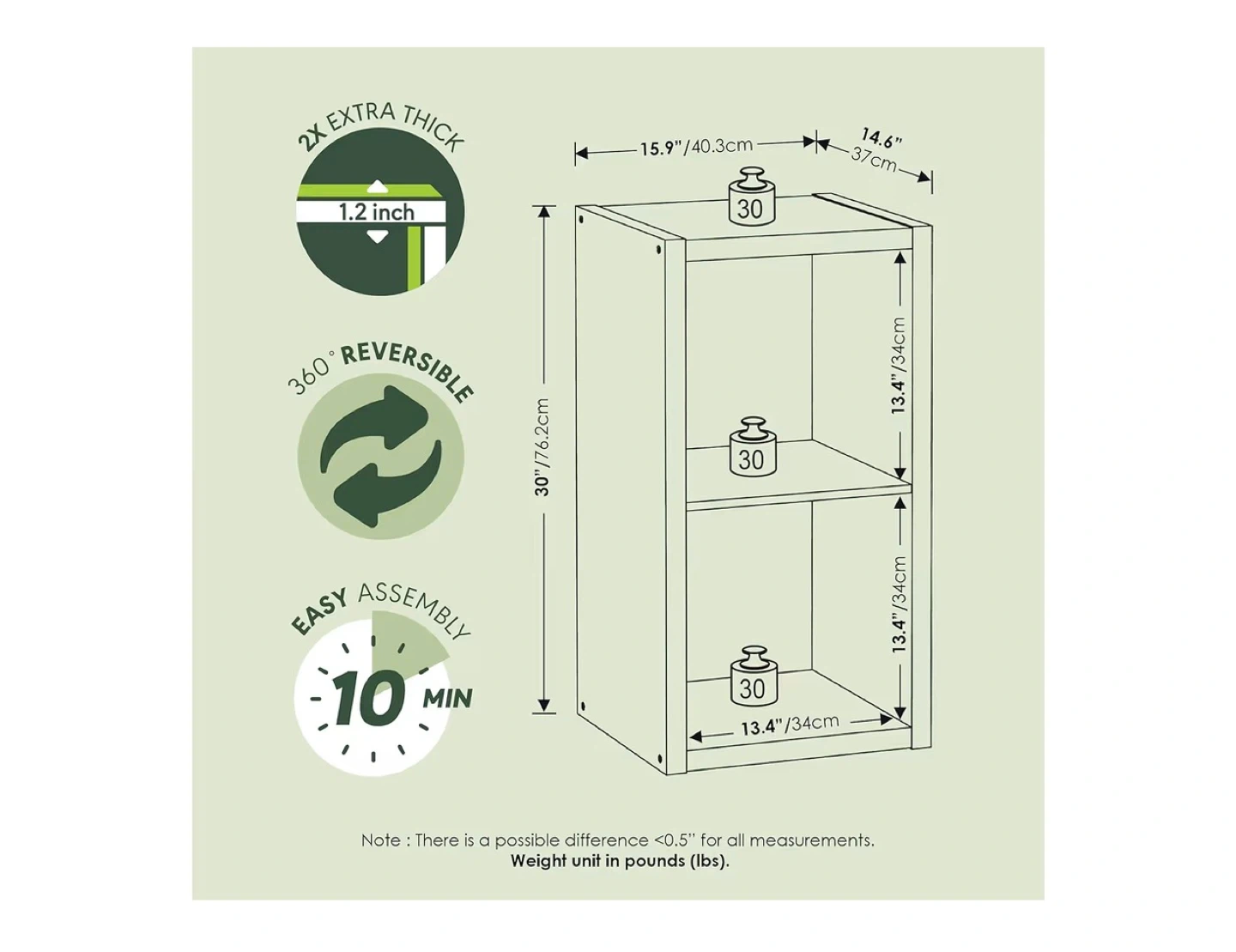 This white 2-shelf cube storage unit measures 30"H x 15.9"W x 14.6"D. It's reversible and features easy assembly. The shelves are 13.4" high.