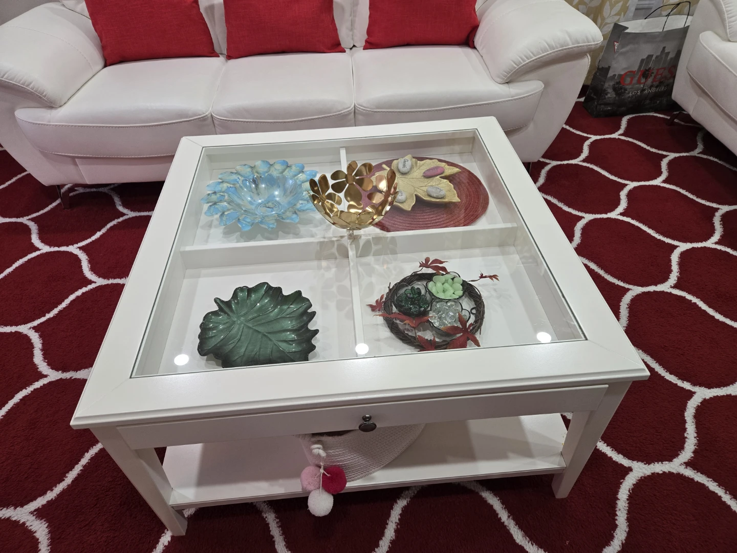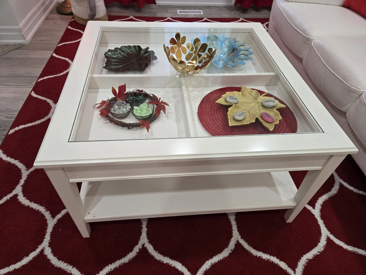 Here's a lovely white coffee table with a glass top! It's in great shape and would be a nice addition to any living room or sitting area. Accessories are not included in the price.