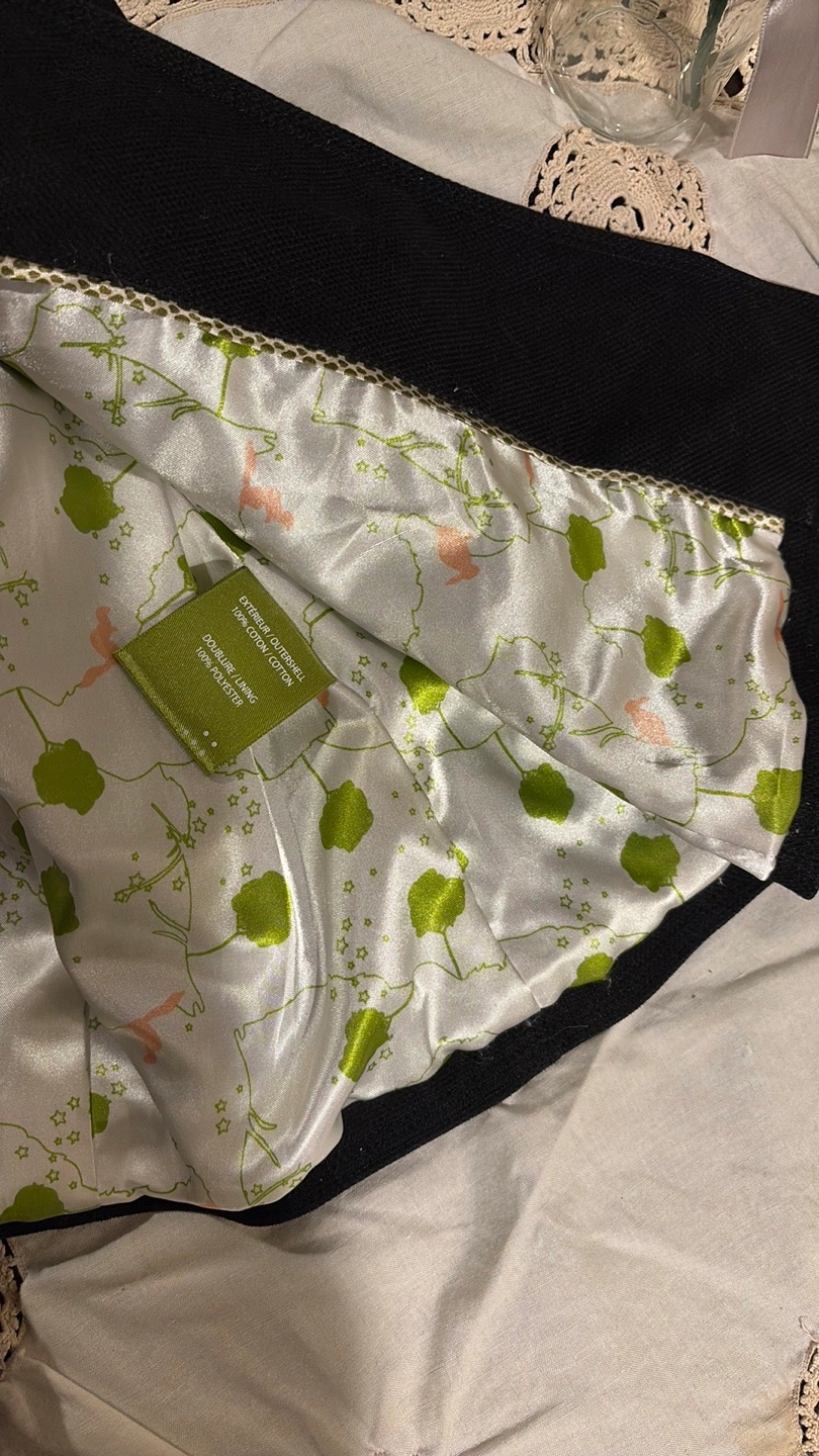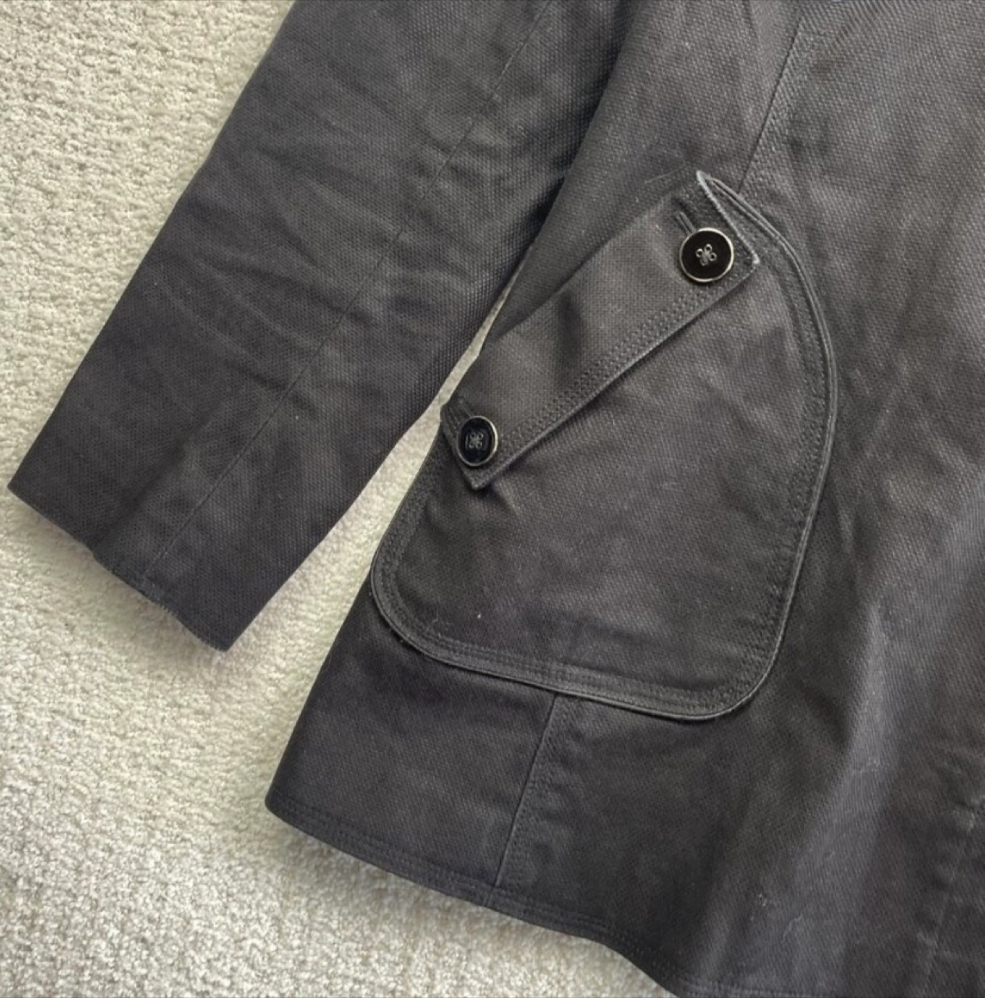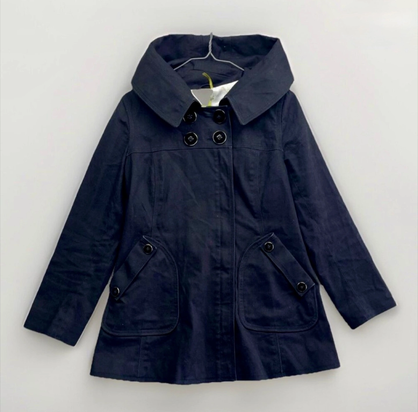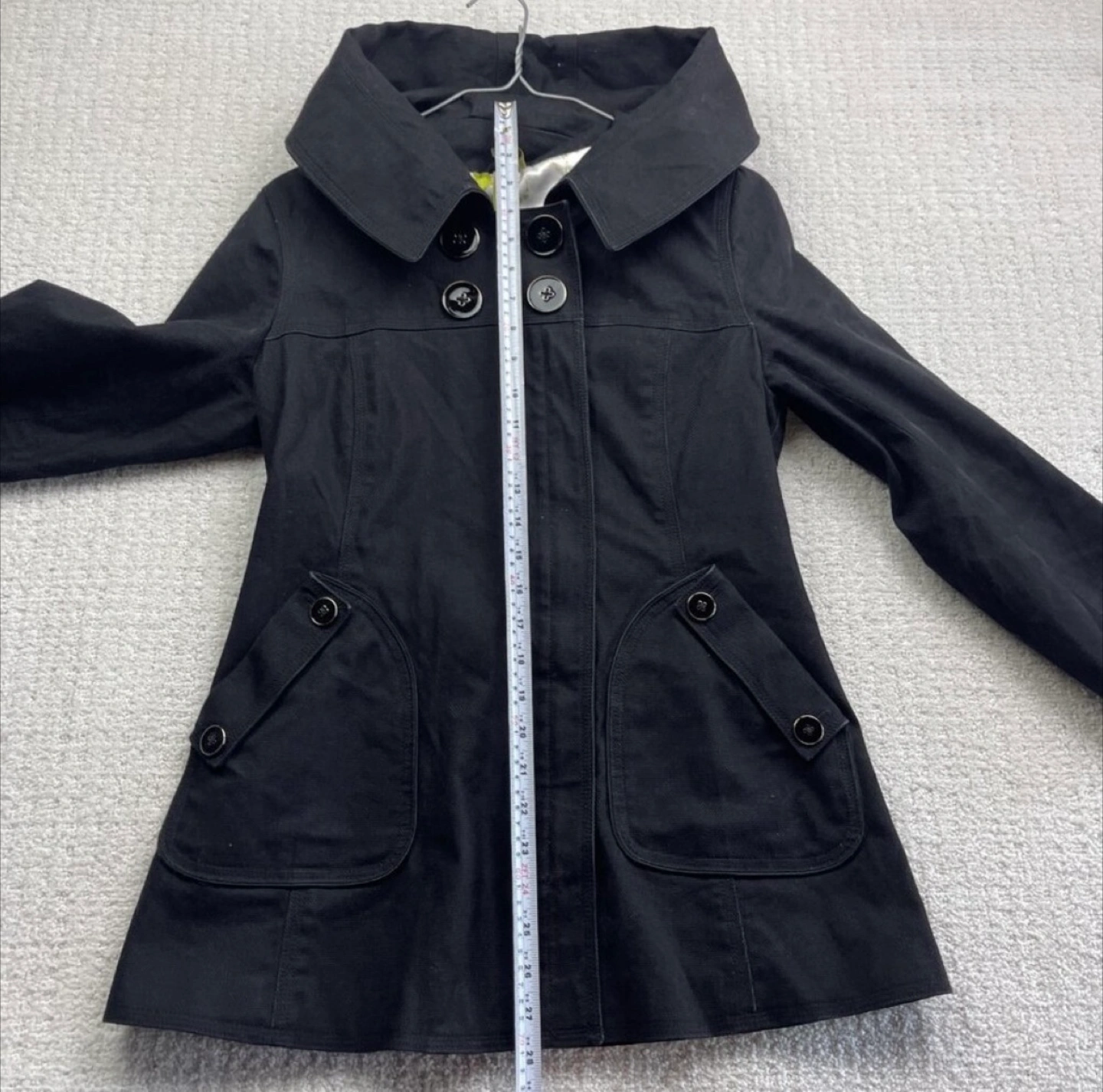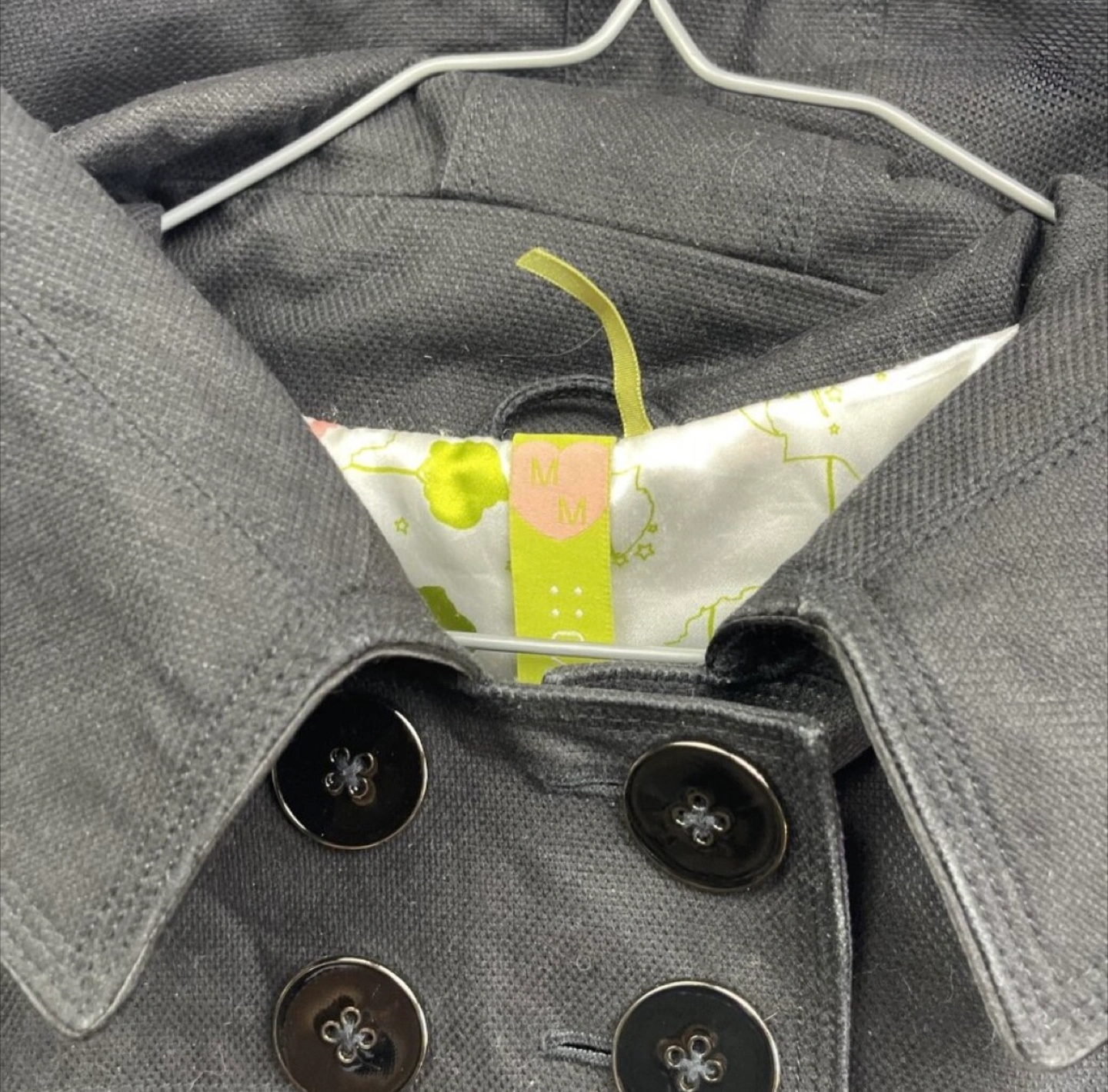 87Stylish black canvas coat with double-breasted design. Features large buttons, front zipper and side pockets. Has a hood. Fun pattern satin lining. Gorgeous details; famous Soia & Kyo design and quality. Excellent pre-owned condition, like new. Size M, but fits smaller - check the measurements. I am so sad it doesn’t fit me.