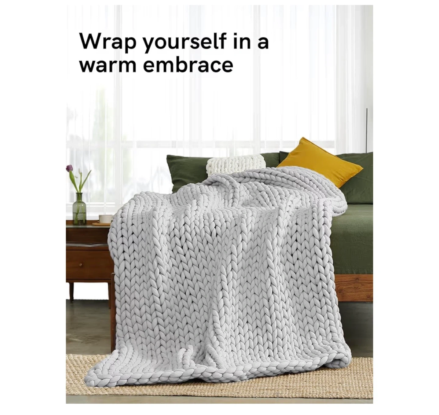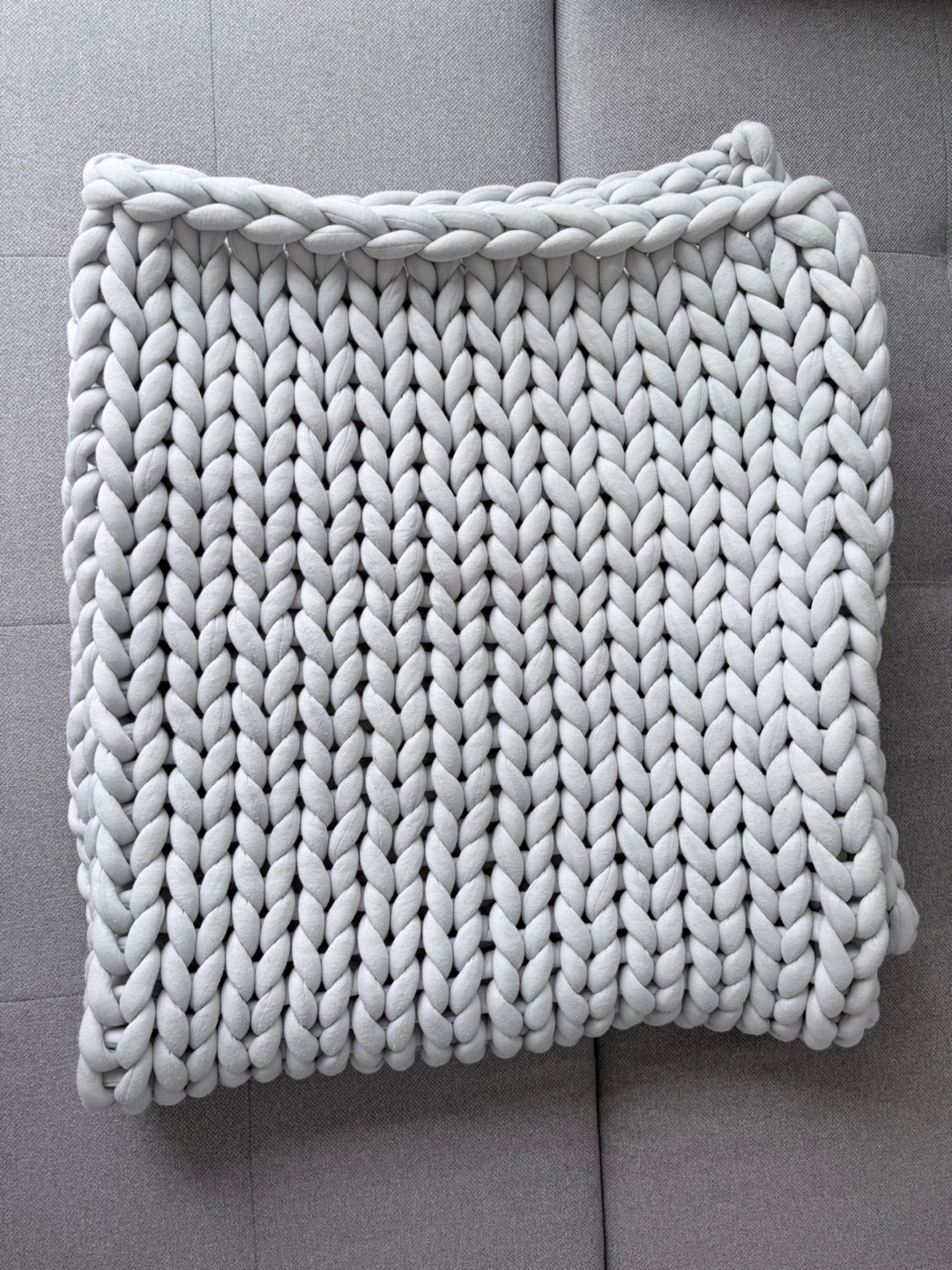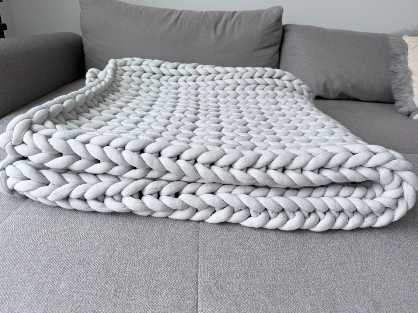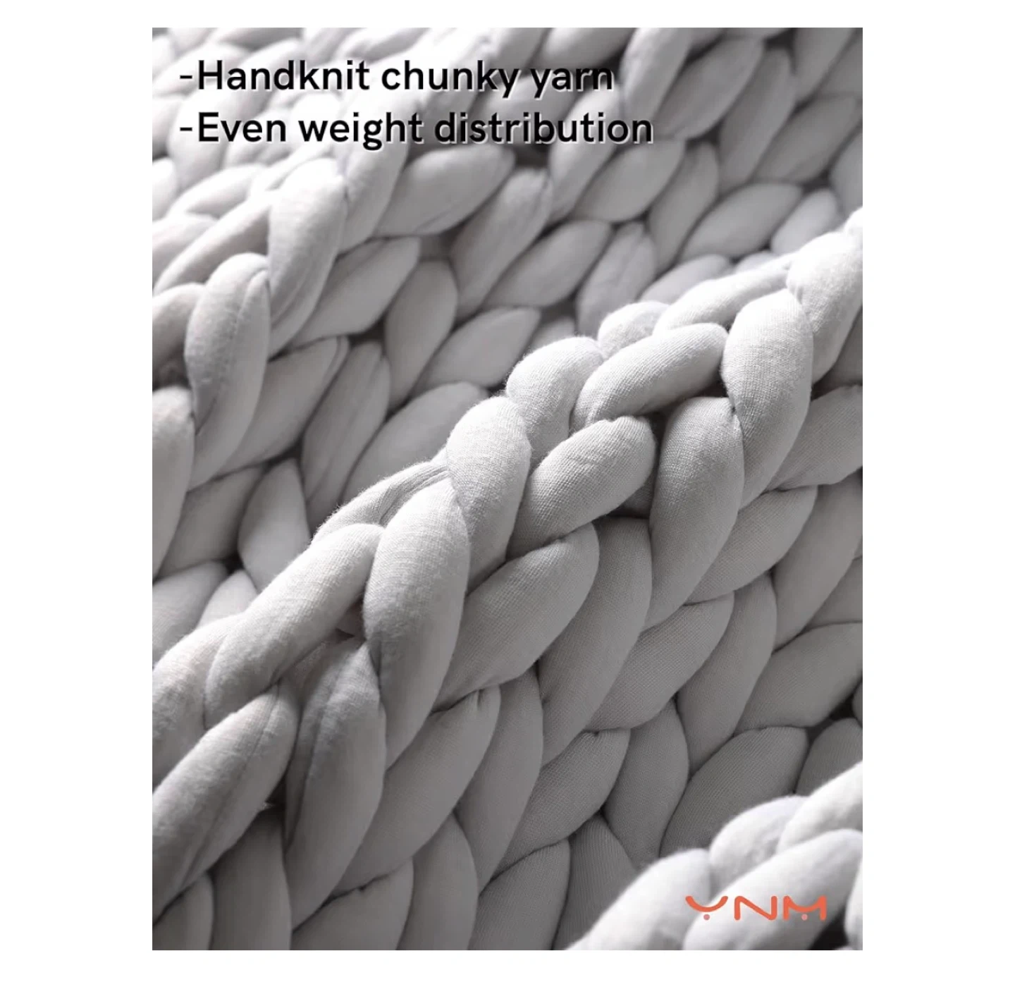 • [Build Quality] This YnM weighted blanket is handmade with care. The weight is maintained by the chunky yarn, made from 100% polyester, and the tightness of the knitting. The even knit ensures the weight is evenly distributed, so the blanket is built to last for years.