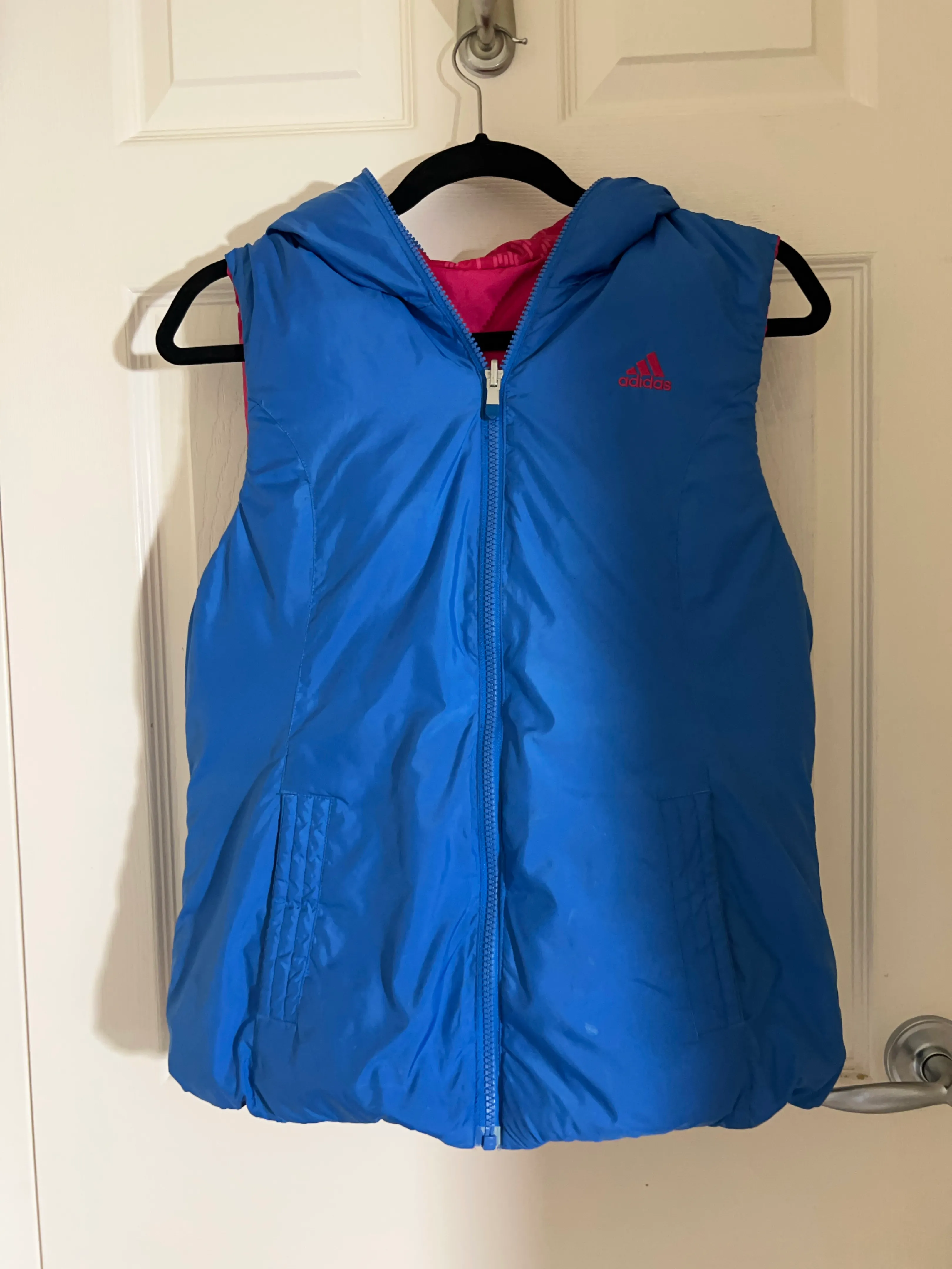 Reversible blue and pink Adidas puffer vest with a hood. It's sleeveless and has pockets on the front. Great for layering during cooler weather!