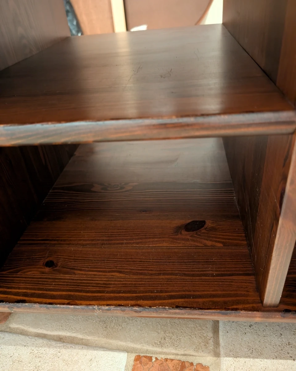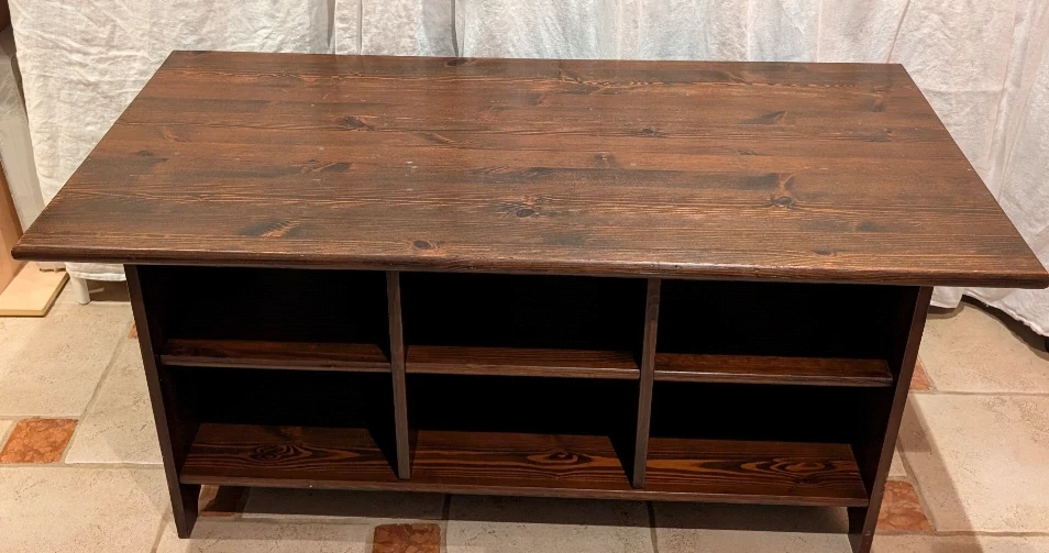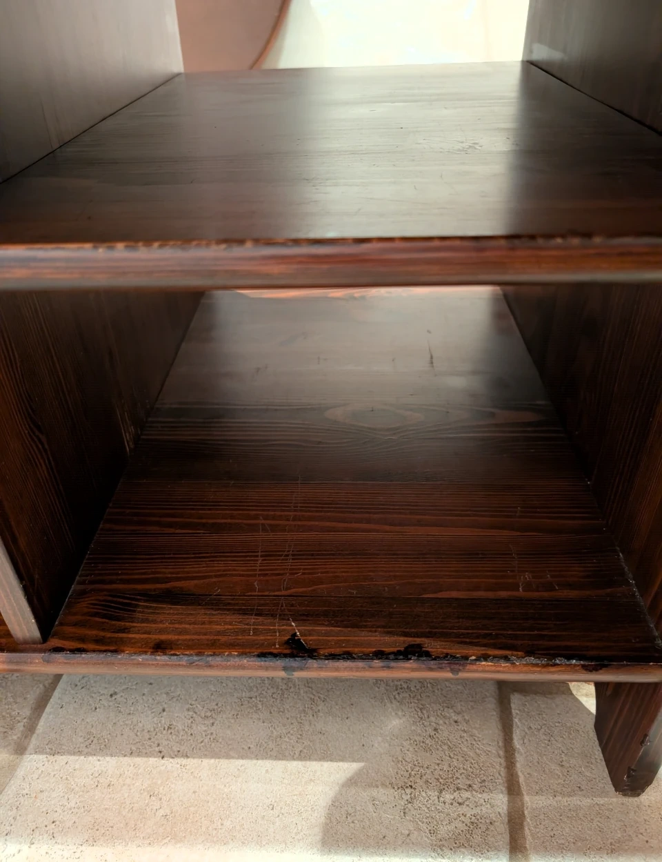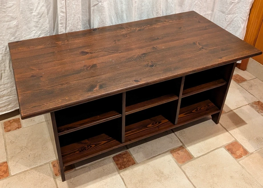 512📍Keele and Rogers Cash only Solid wood TV console or Coffee table. It has a dark brown finish and some wear and tear. Great for living room storage! I got this to refinish but I won't have time. Looks to be a vintage IKEA piece. L - 46" 3/4 W - 23" H - 21" Storage home decor solid wood Pine Organization