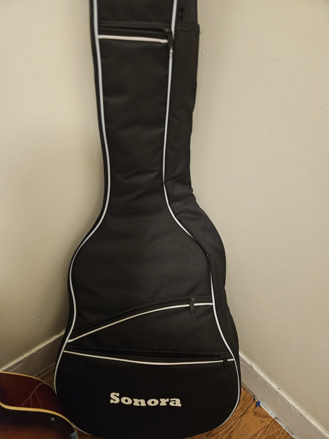 Lawson acoustic guitar with a sunburst finish. It includes a black Sonora gig bag for protection and transport. This guitar's body is made of wood with a rosewood fretboard.(however guitar has a few scratches on the back )