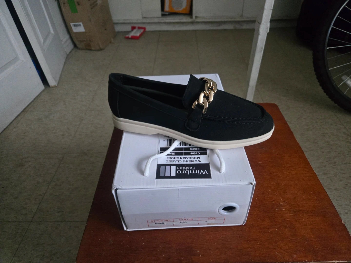 Black Wimbro women's classic moccasin shoes with a gold chain detail. These stylish flats are a size 6. They offer a comfortable and fashionable option for everyday wear.