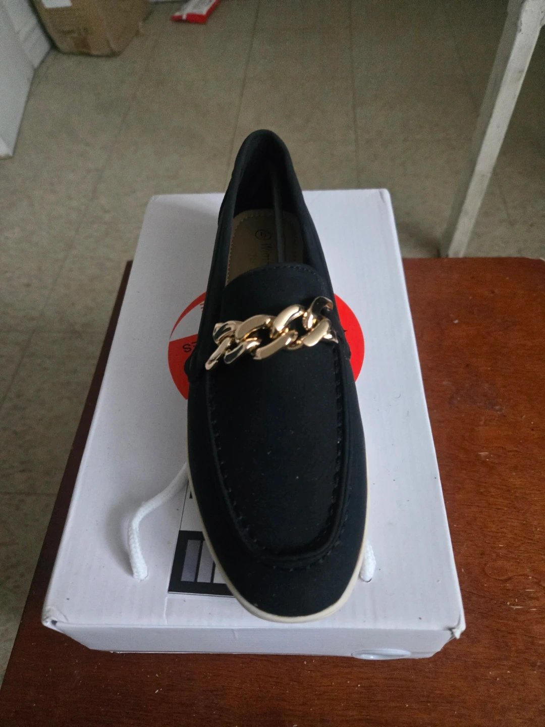 Black Wimbro women's classic moccasin shoes with a gold chain detail. These stylish flats are a size 6. They offer a comfortable and fashionable option for everyday wear.
