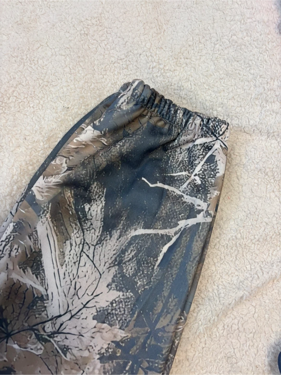 These jogger pants are camouflage print with leaf designs. They have an elastic waistband with a drawstring and elastic cuffs.