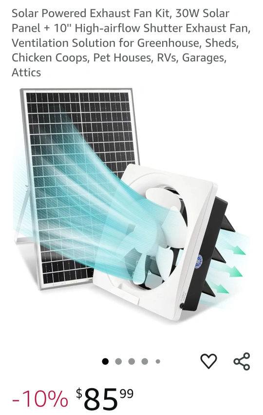 Selling a solar powered exhaust fan kit! It includes a 30W solar panel and a 10" high-airflow shutter exhaust fan. Great for ventilation in greenhouses, sheds, chicken coops, pet houses, RVs, garages, and attics. Originally priced at $85.99