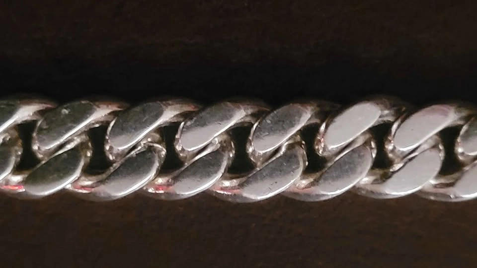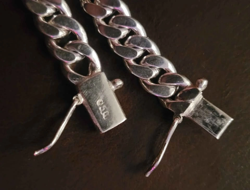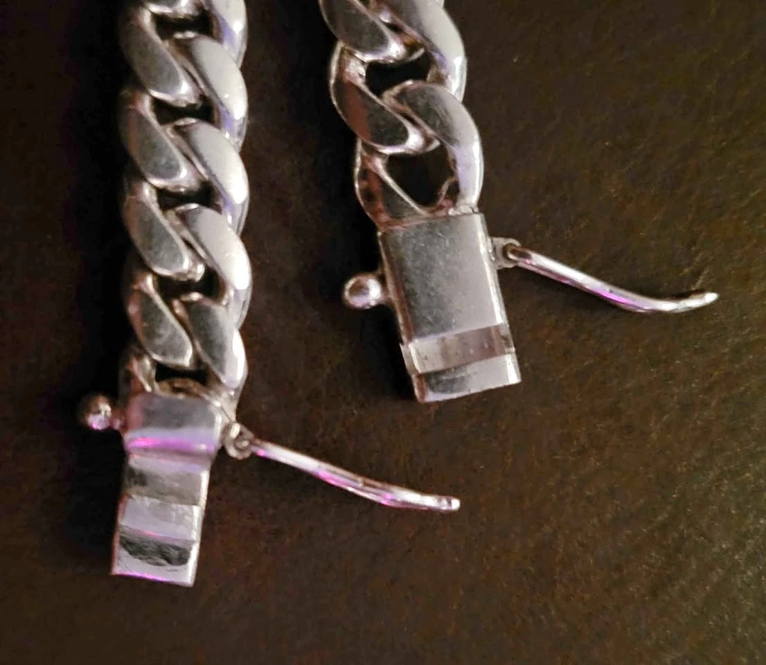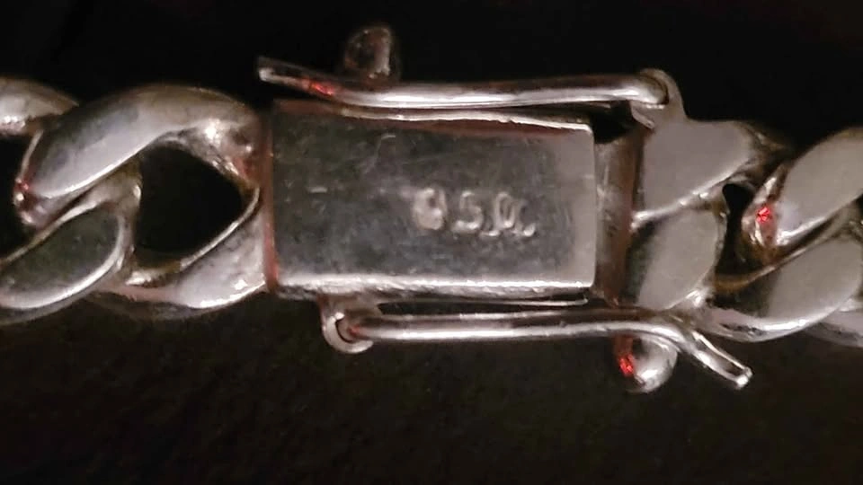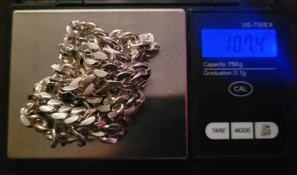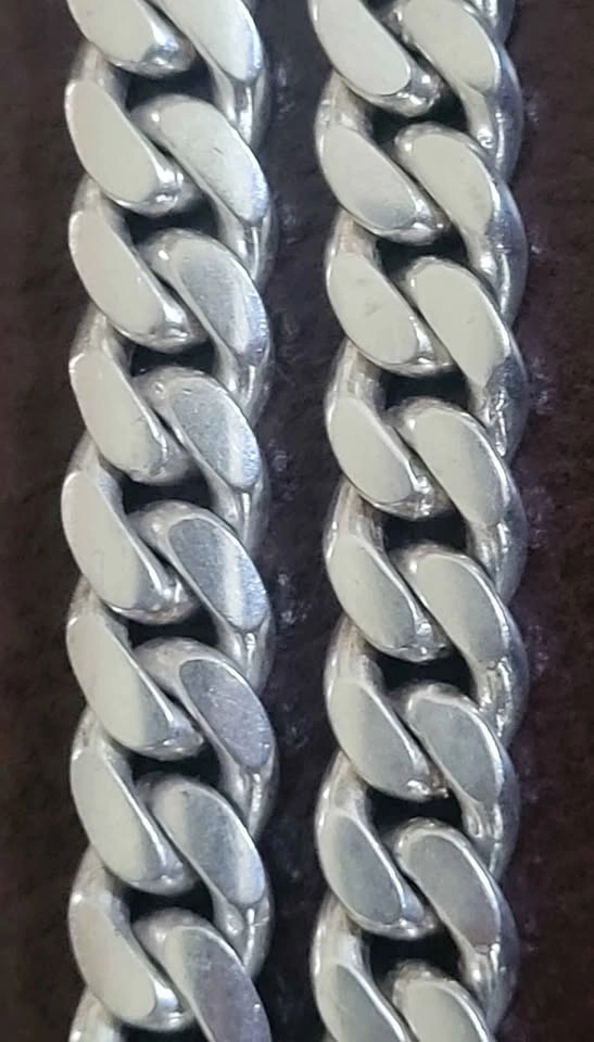 86Selling this beautiful solid .950 silver ( 107.4 grams ) handmade 25" cuban link chain. Asking $600 OR make me your best offer! The chain has a double locking secure clasp. This is a beautiful piece and would look amazing with a pendant or on it's own as is. Its a solid, heavy, and well made piece. 25" long 107.4 grams .950 % silver Cuban Link Double Clasp