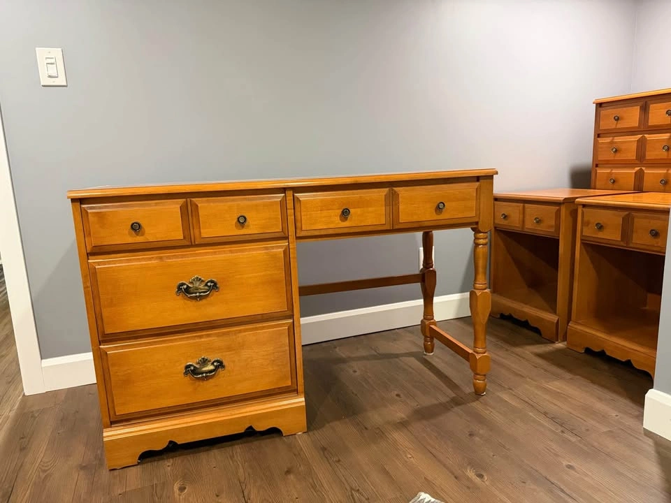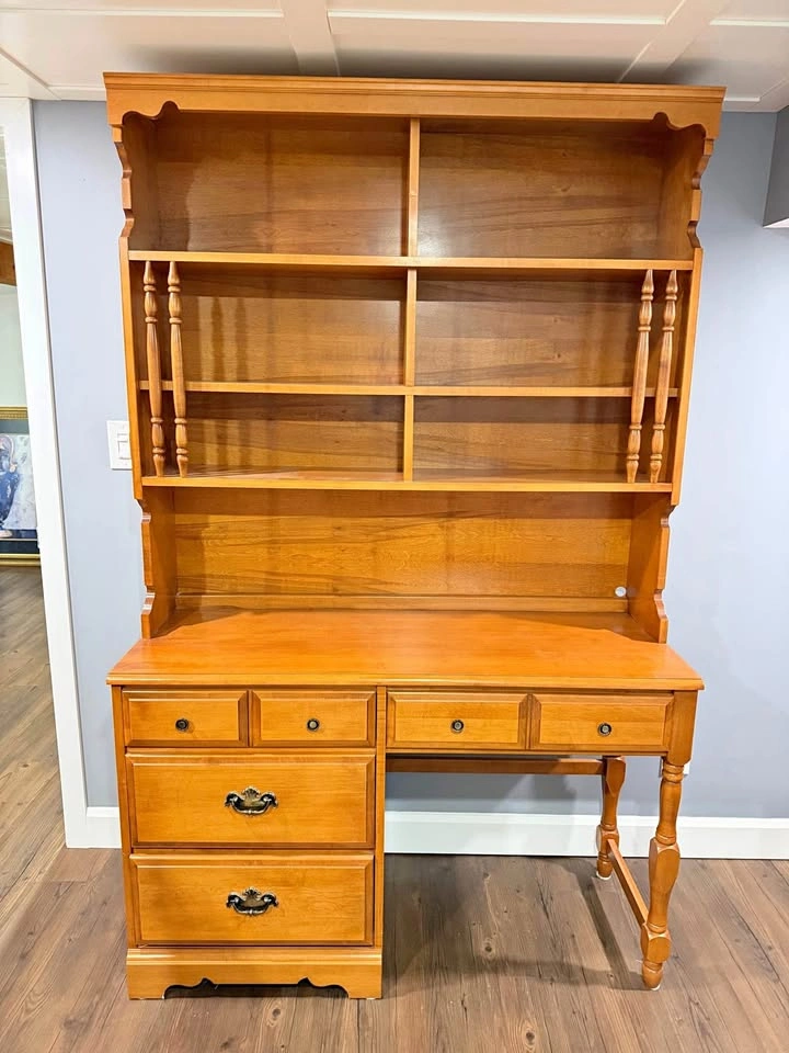 10Beautiful solid wood desk with matching hutch. Features three spacious drawers on the left side, two smaller drawers along the top, and open shelving above for books, décor, or display items. The warm honey finish highlights the natural wood grain, and the turned wood details give it a classic, timeless look. Perfect for a home office, student workspace, or as a charming addition to a bedroom or living area. Dimensions (approx.): • Width: 48” • Depth: 18” • Height: 72” (30 without hutch Excellent condition – sturdy, clean, and well cared for. Downsizing - from a smoke free home. Check out my other listings as I also have the dresser and nightstands. Pickup Aldershot