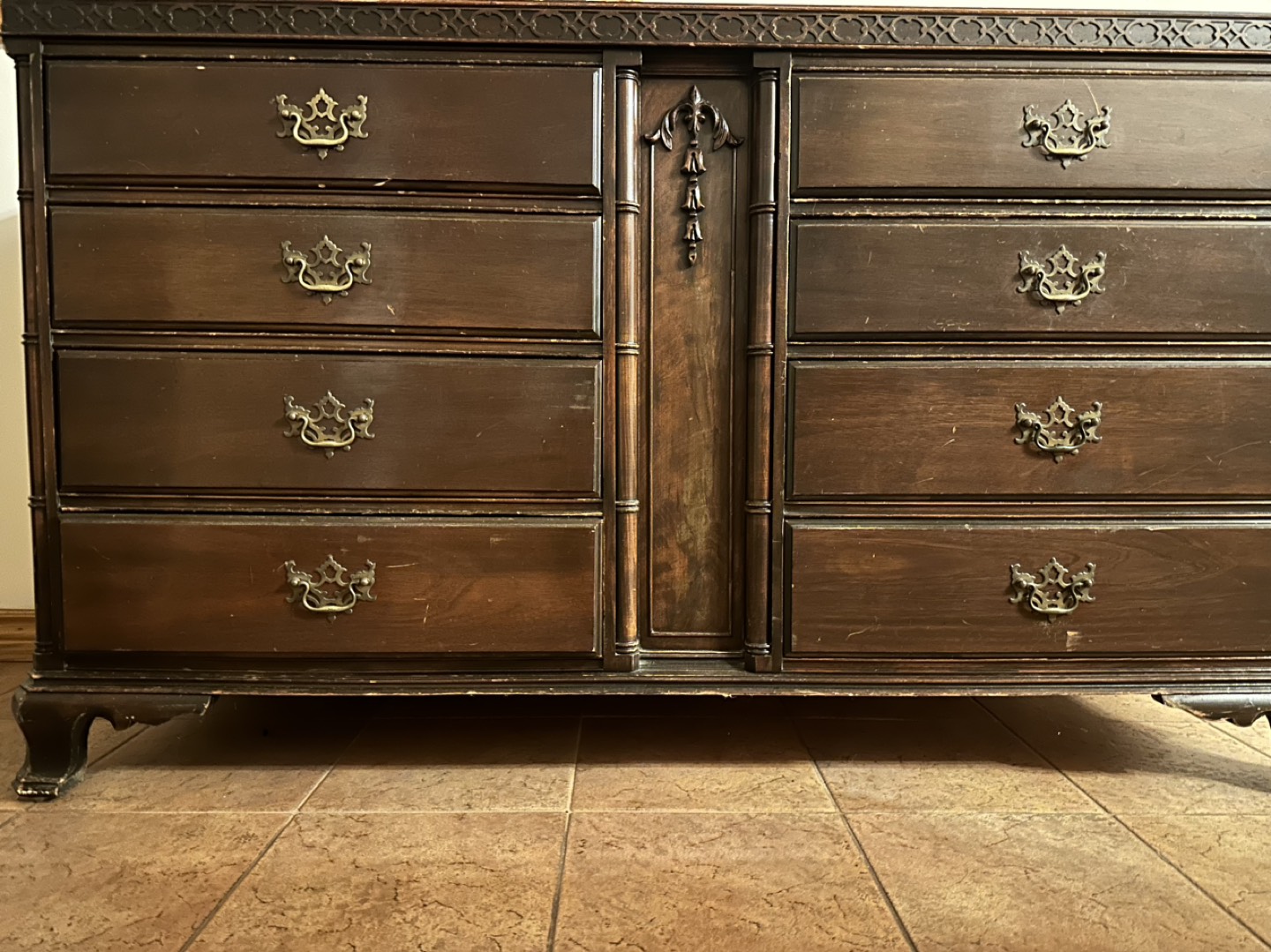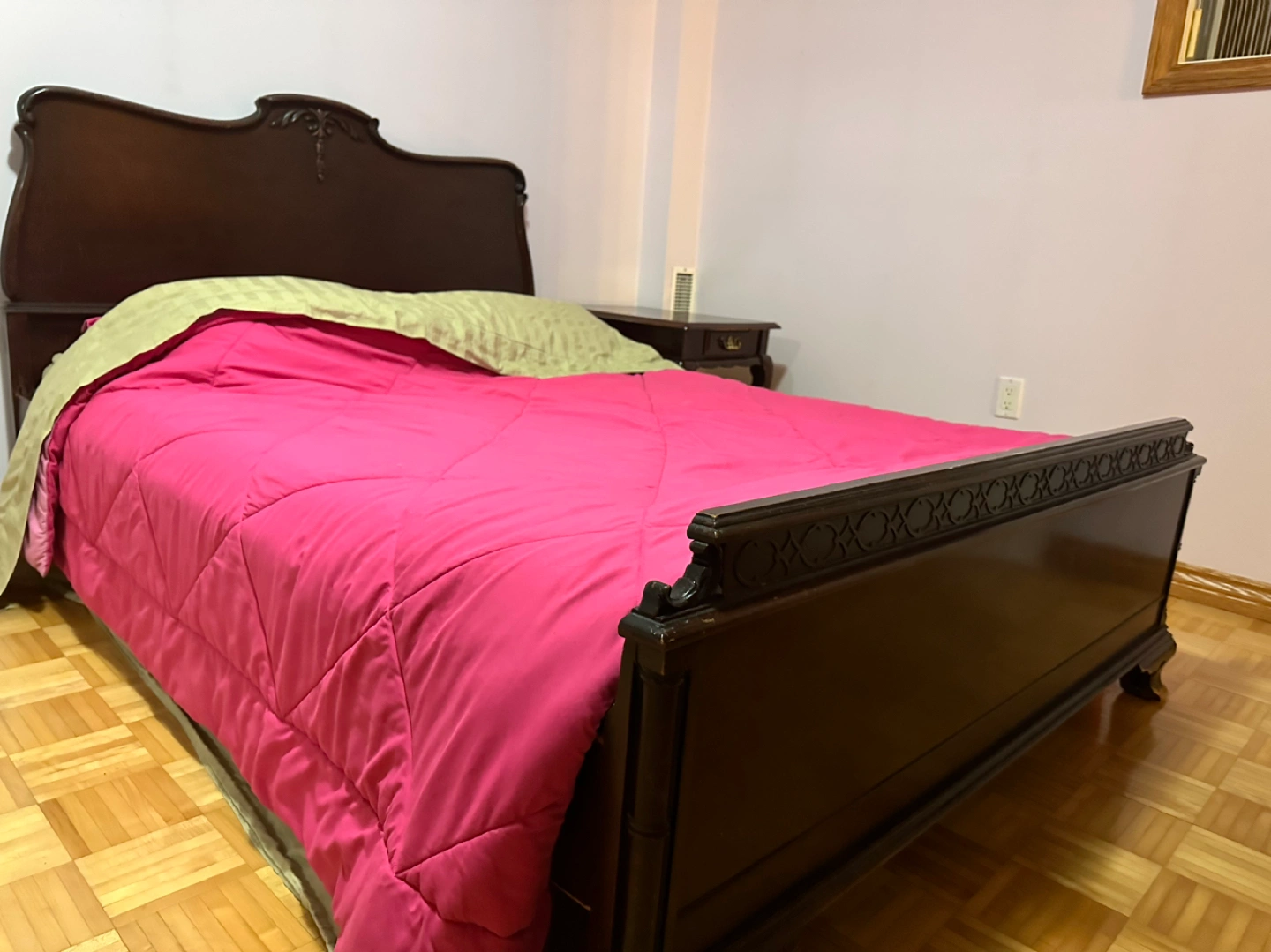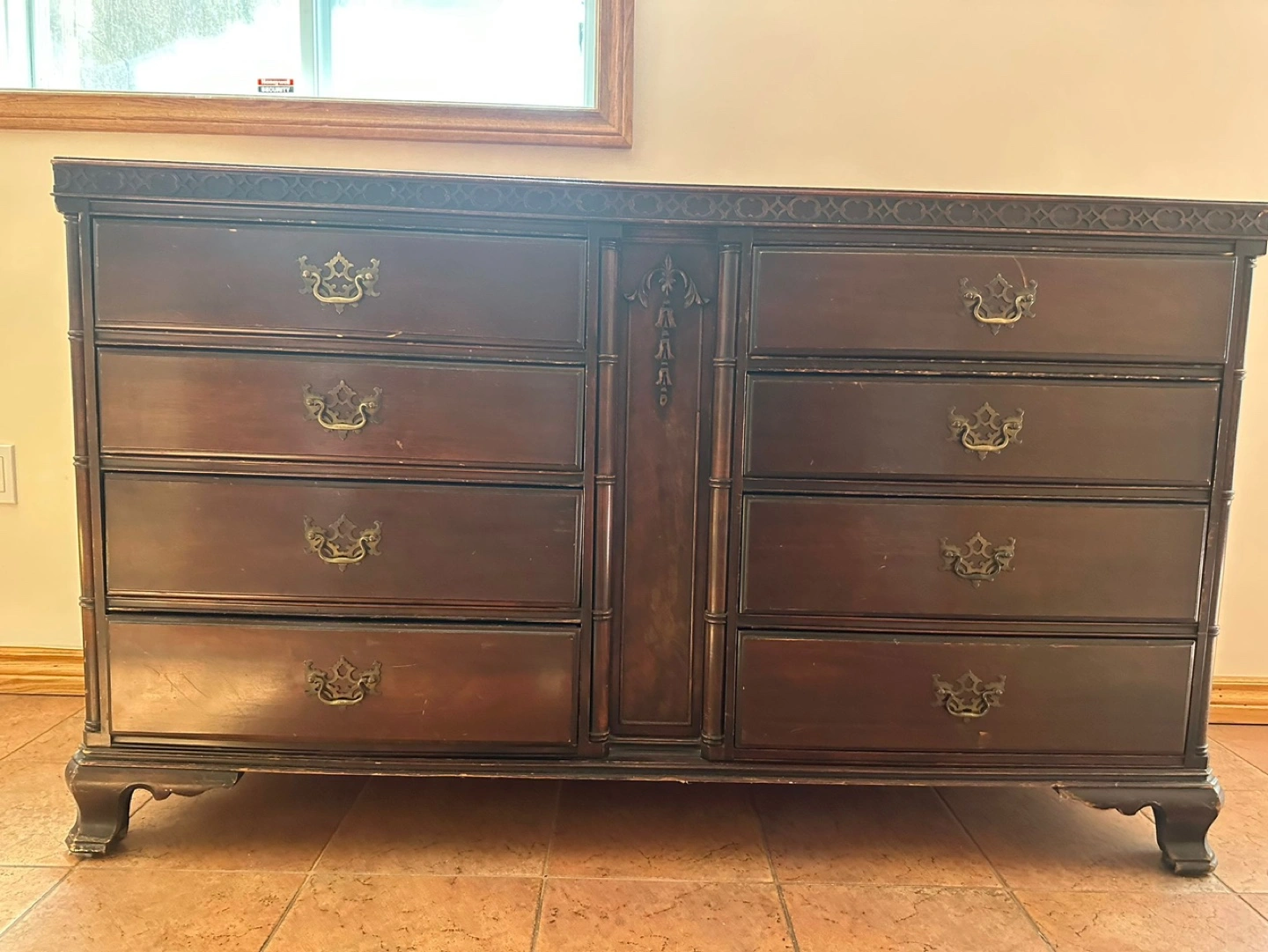 18This is a solid wood four pieces of bedroom set. Excellent condition, You can use as it is or give new life by painting! 6 drawers dressers 8 drawers With mirror Bed frame size double Night stands