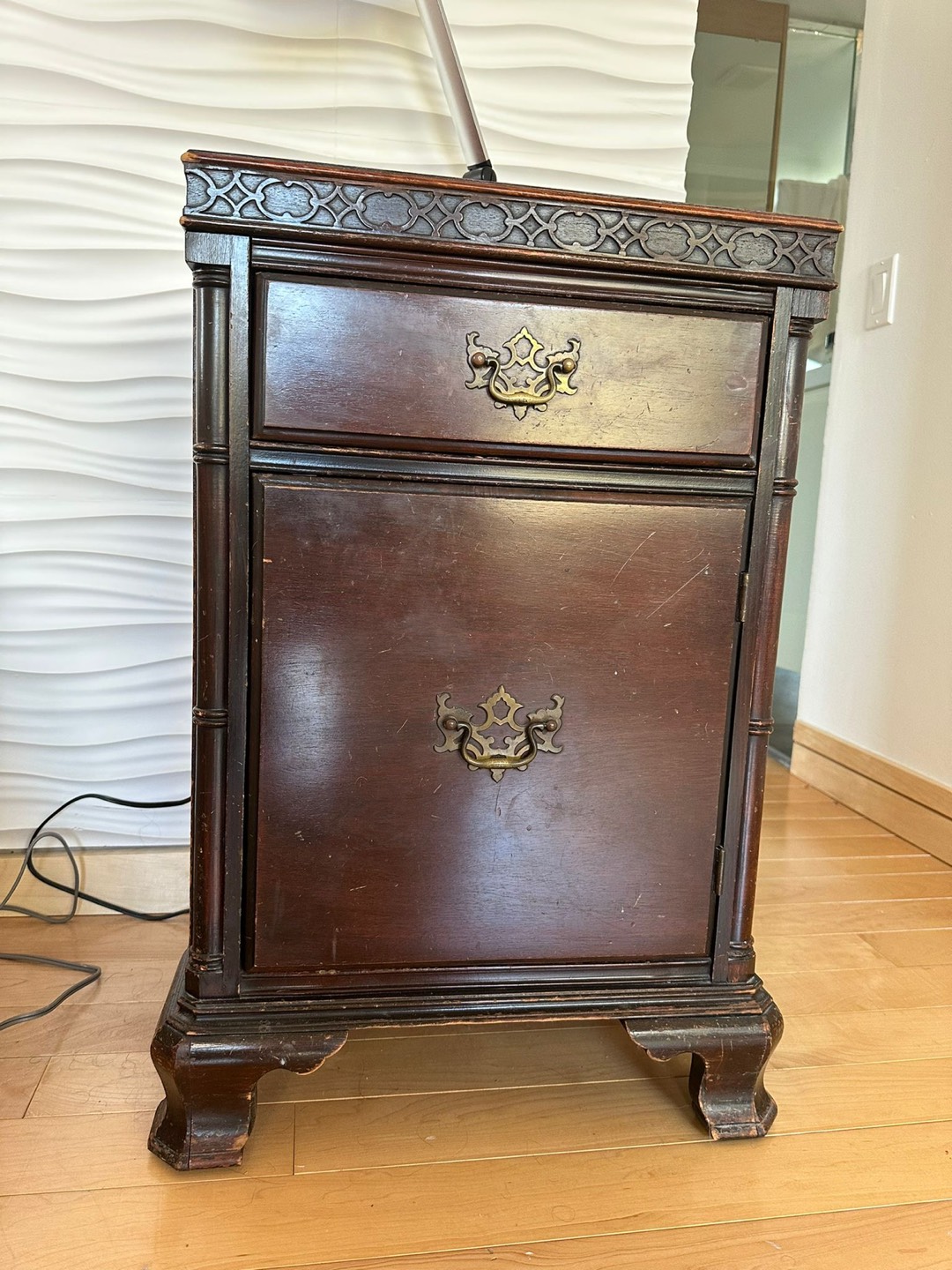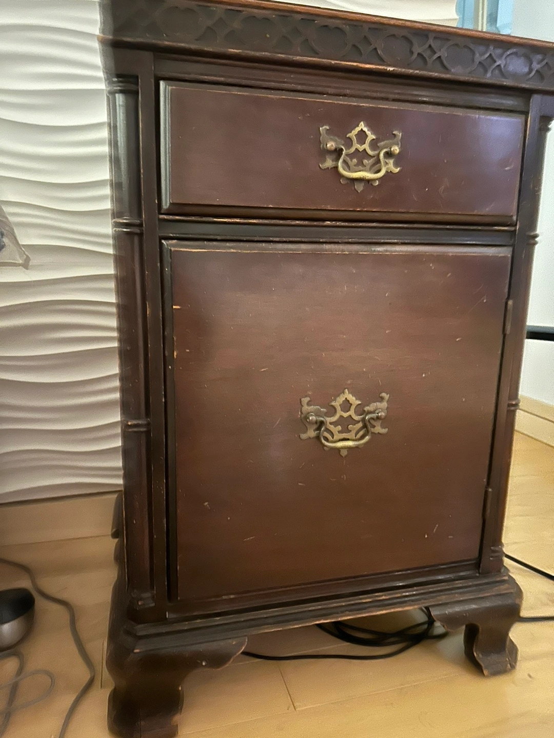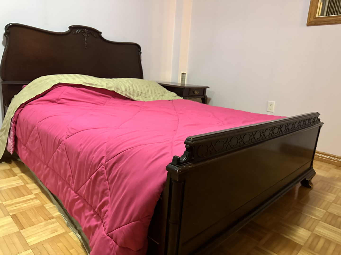 18This is a solid wood four pieces of bedroom set. Excellent condition, You can use as it is or give new life by painting! 6 drawers dressers 8 drawers With mirror Bed frame size double Night stands