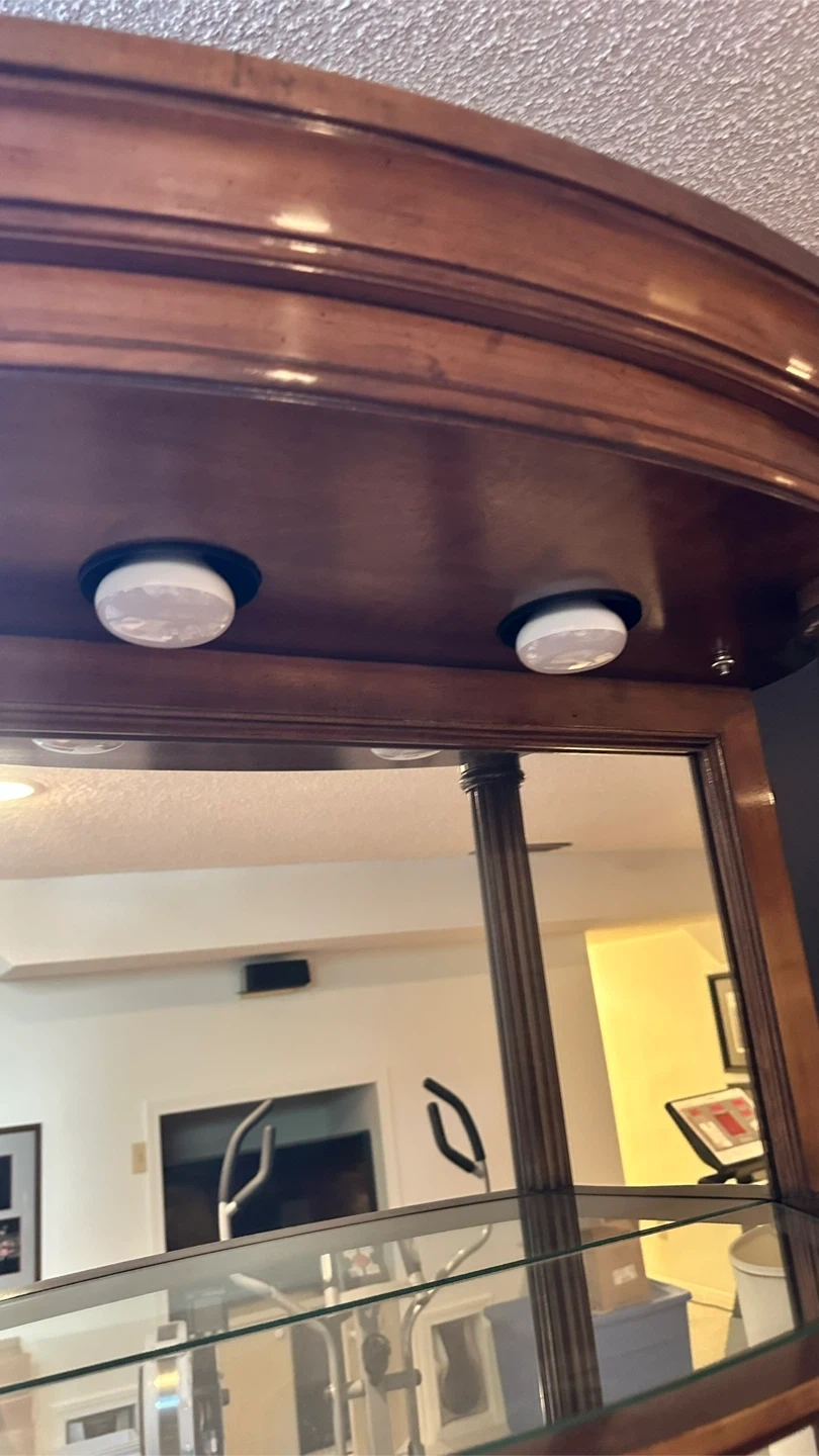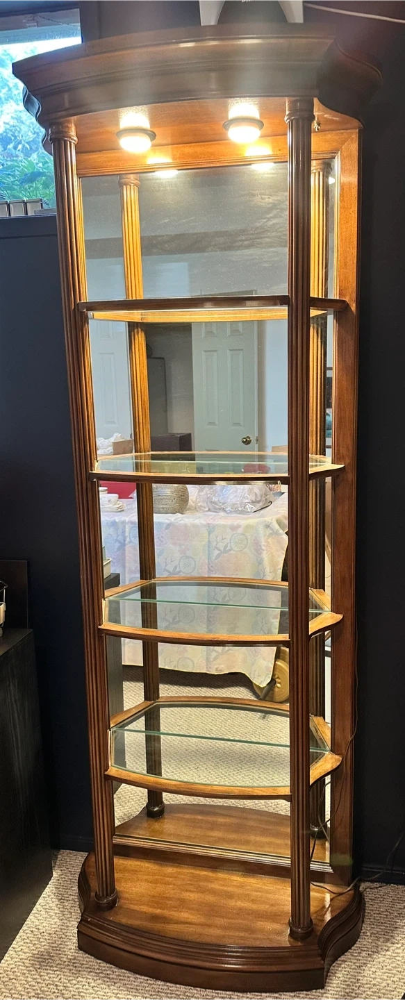 Selling a lovely curio cabinet with glass shelves. It's in great shape and would be perfect for displaying your favourite items. It features a wood frame and built-in lights to showcase your treasures