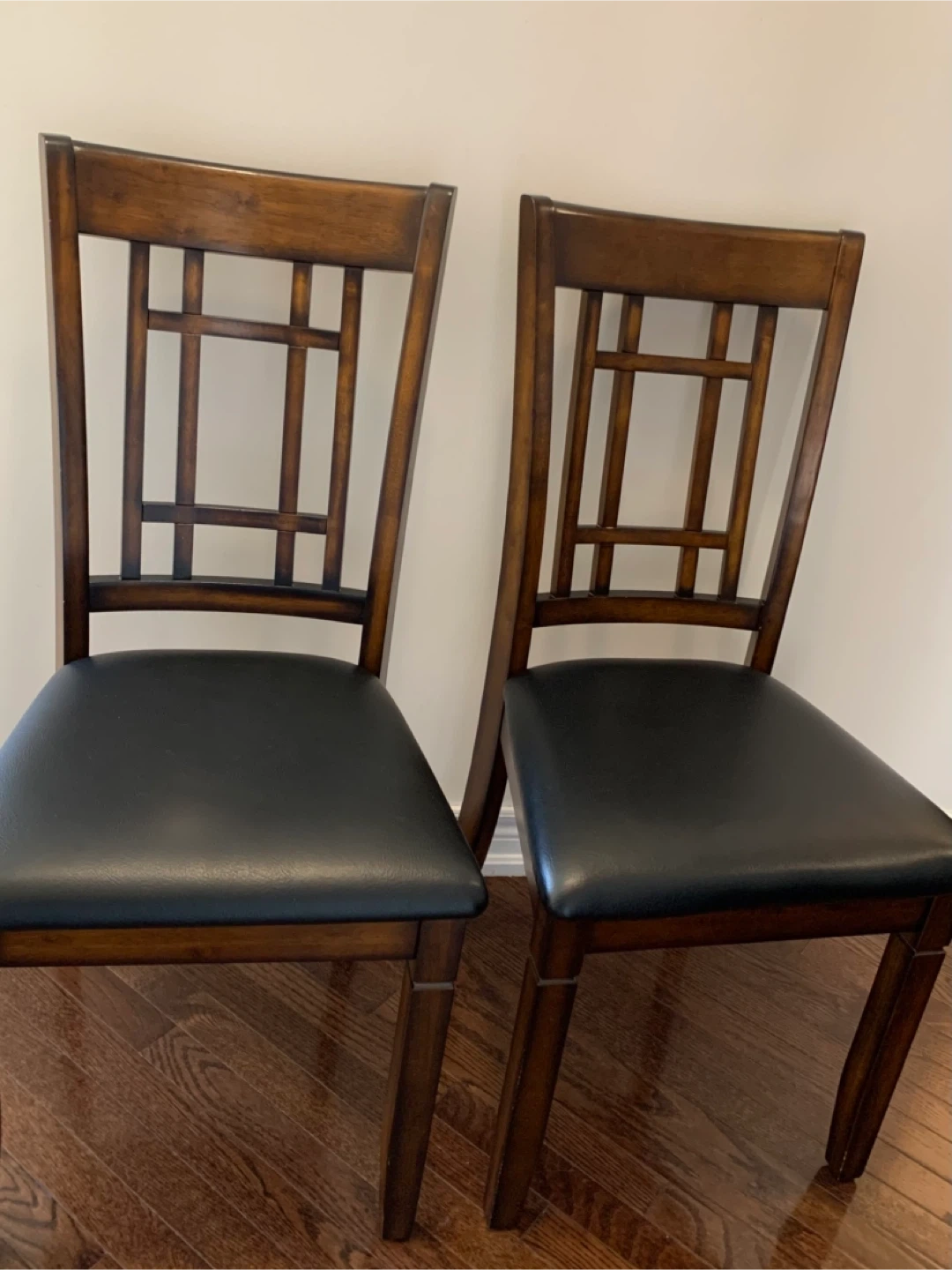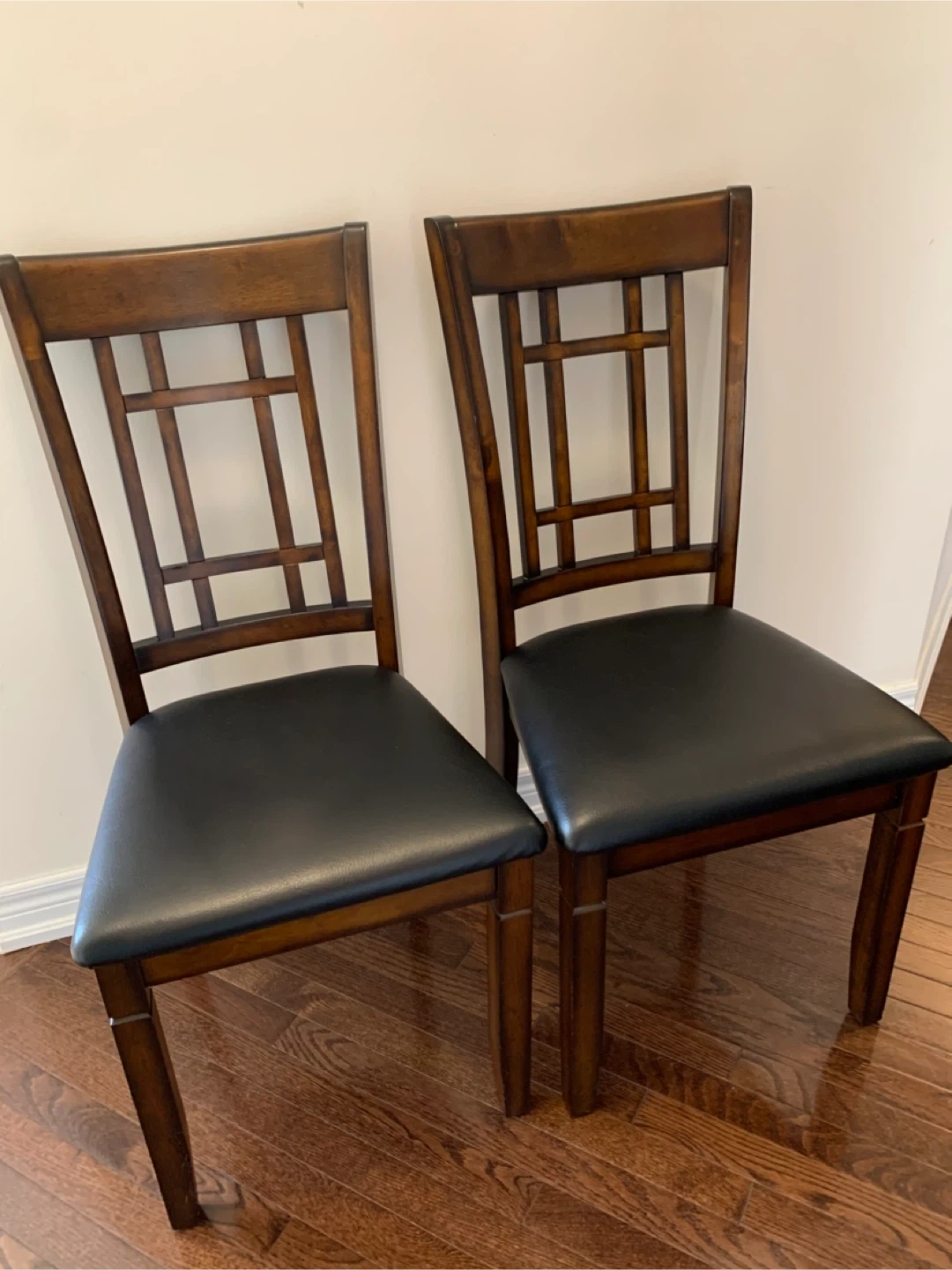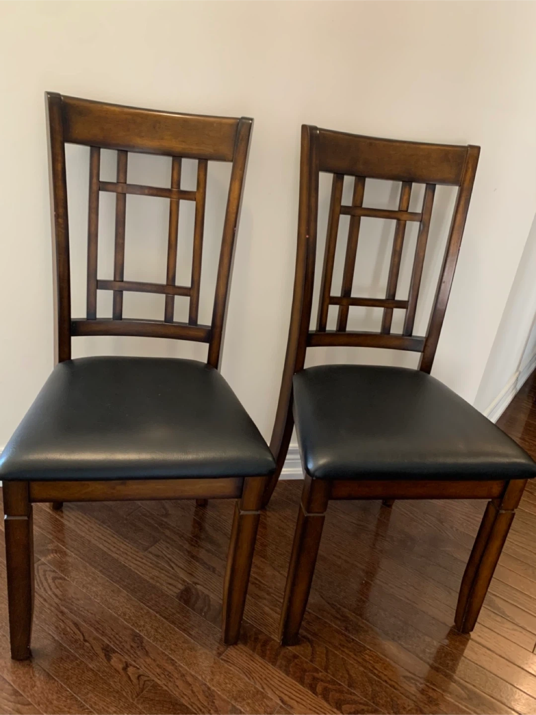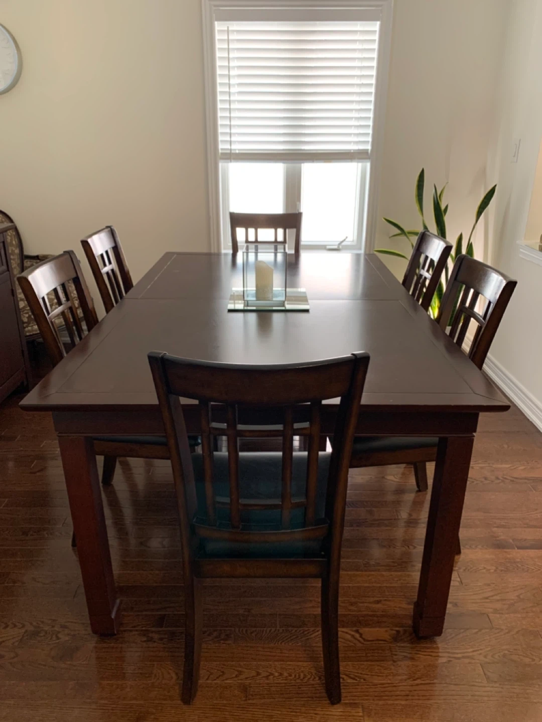 364Selling a rich, dark wooden table set. The table comes with an extendable leaflet to see 8 people. The chairs feature a dark wood frame and comfortable black leather seat in mint condition. They would look great in any dining room! Can sell 2 more matching chairs, please see my other listings.