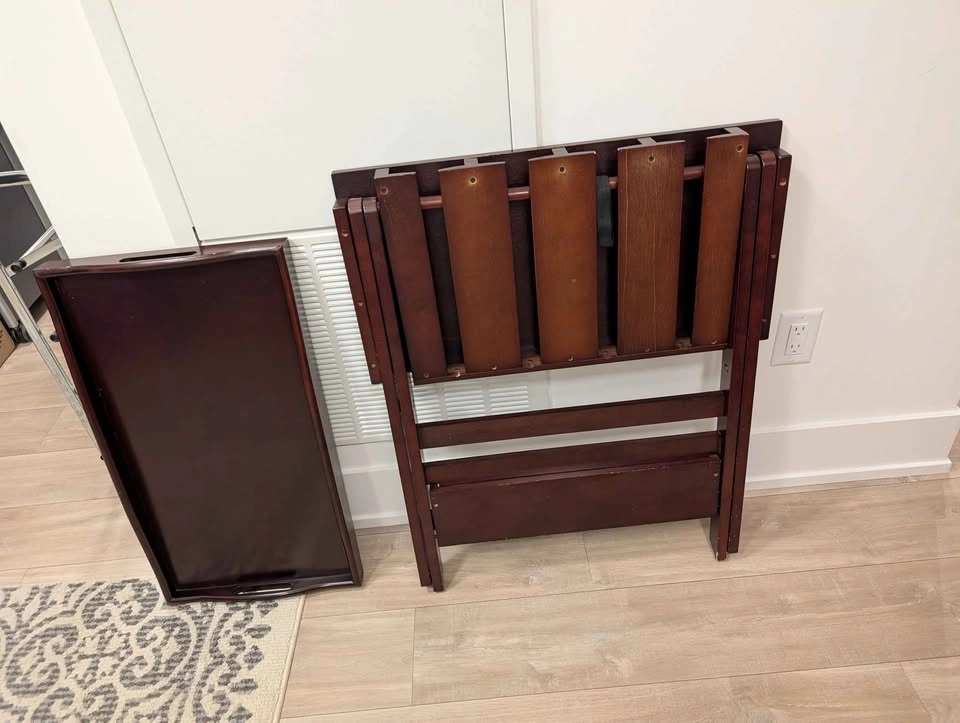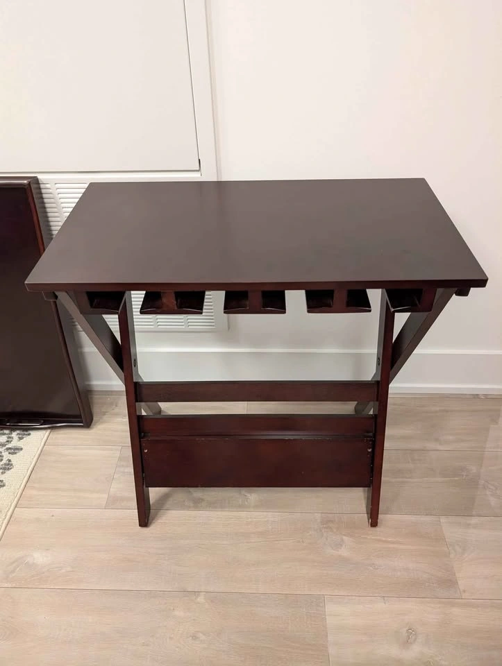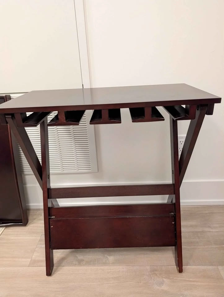 70A very versatile solid wood tray table with 4 wine glass racks( can hold 12 to 15 wine glasses). Folds flat for easy storage and transport. The tray table is removable and has an additional folding magazine holder shelf. Very sturdy and stable. One side slightly looser due to a stripped screw. Can be easily fixed with wood filler and screwing back up. Dimensions: 28in L x 15.5in W x 30.5inH