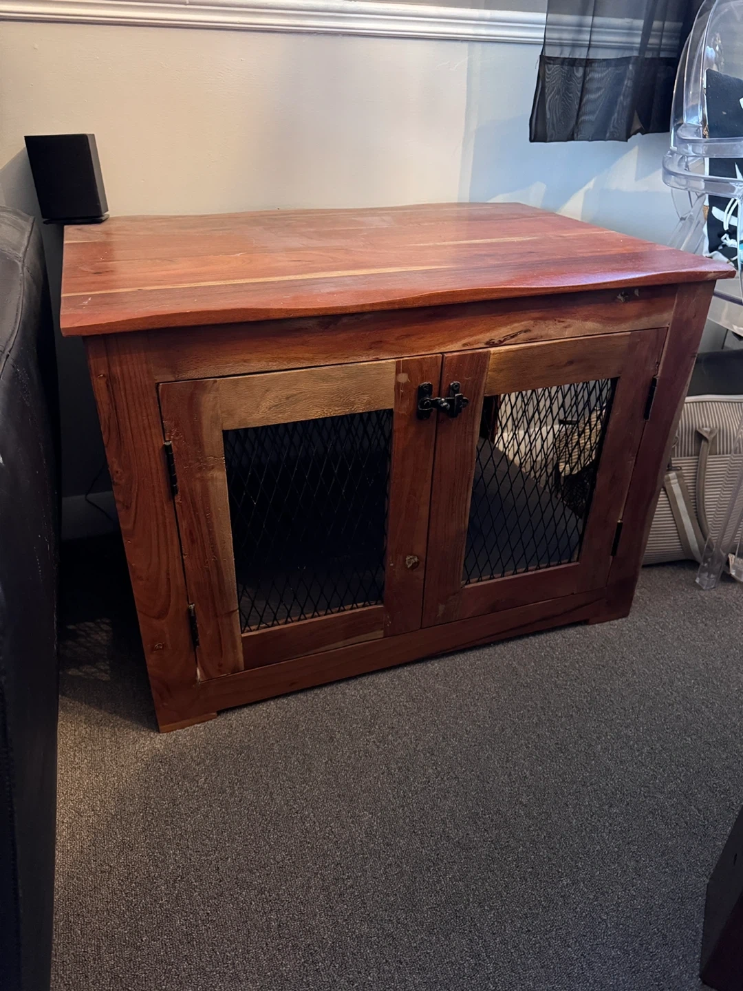27In 9/10 condition! Barely used - purchased as a cat crate for temporary use while opening our front door but decided not to keep it. Pickup only - requires 2 people. Pickup is at Renforth and Eglinton in Etobicoke. No delivery. Includes pet bed inside which came with when purchased. Solid wood!! Distressed finish - shown exactly as it appeared when I purchased it originally - paid $250+tax ($282) asking $195 or best offer for quick pickup. Measurements: 32” W x 23” D x 23” H
