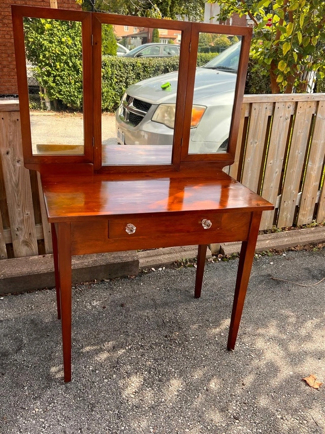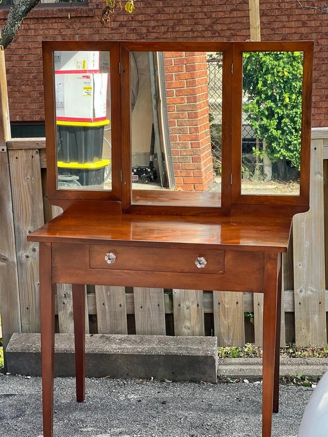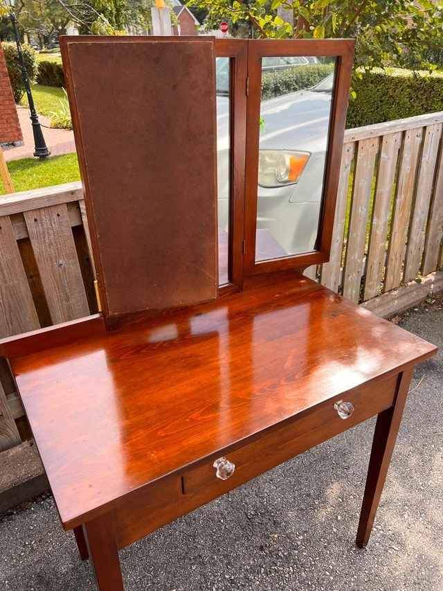 109Solid Wood Vanity/Make Up Desk with 3 Sided Mirror Excellent Condition, Smoke and pet free home. Measurements: 19*34* 30" (inches) high Mirror height is 25.5" VIEW MY OTHER ADS!!!
