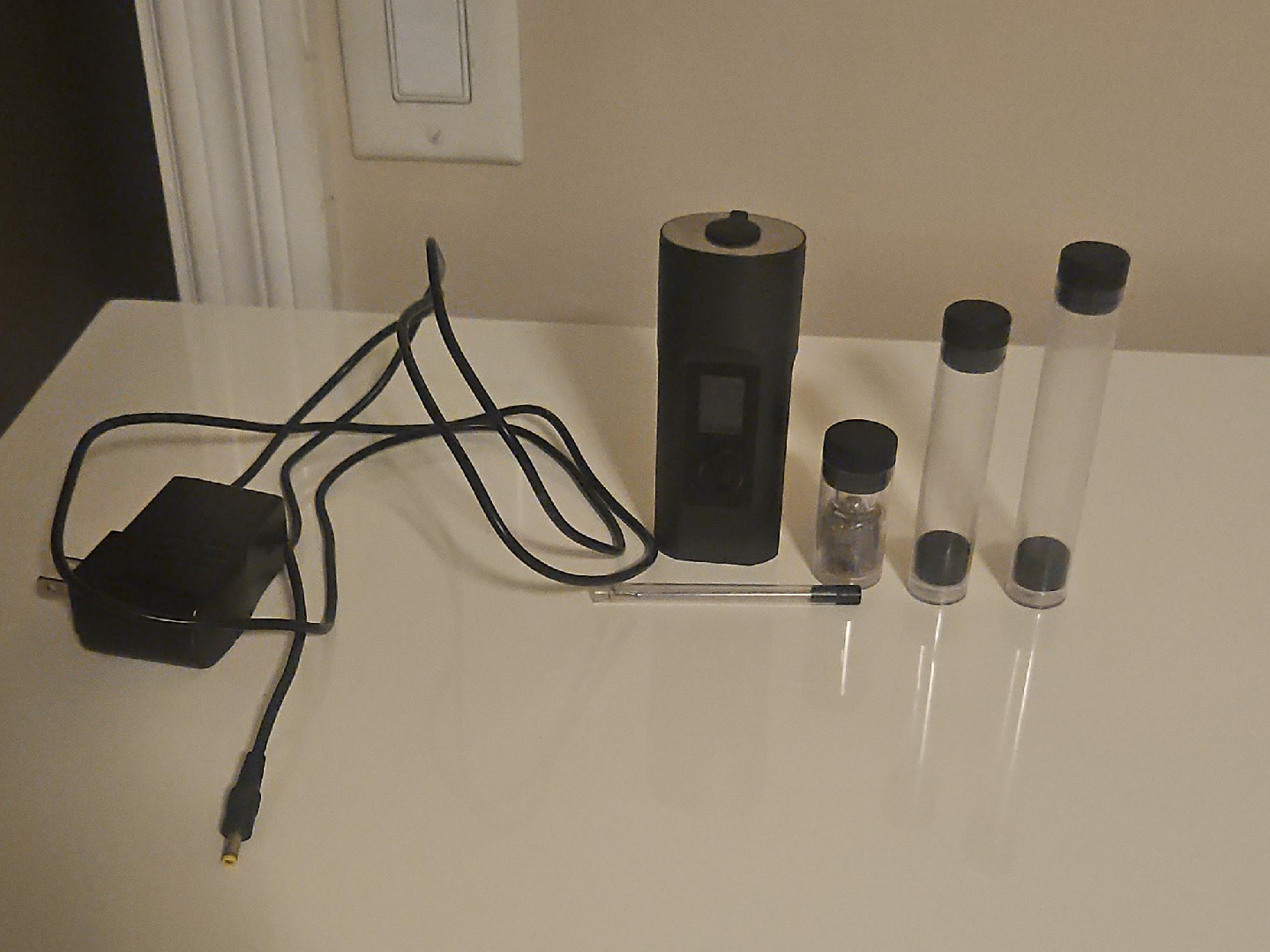 Selling a black portable vaporizer. It comes with the charger, a small jar, and two tubes. Great for on-the-go use!