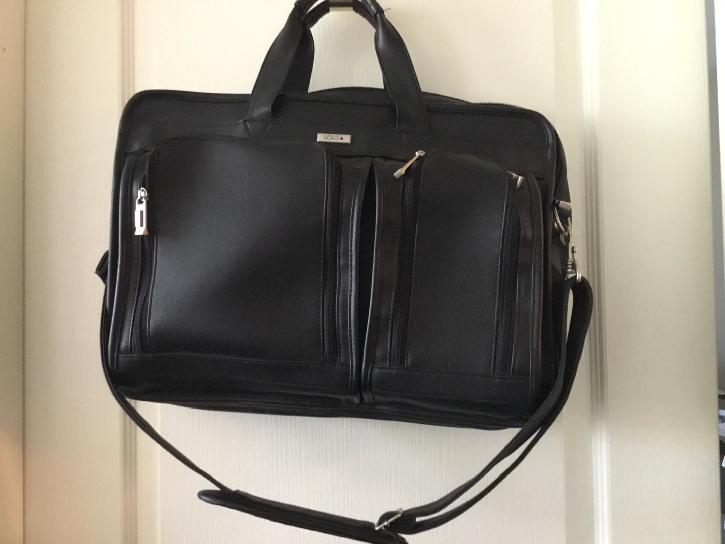 Selling a Solo black leather laptop bag. It's in great condition and perfect for carrying your laptop and other essentials. The bag features multiple compartments and a shoulder strap for comfortable carrying