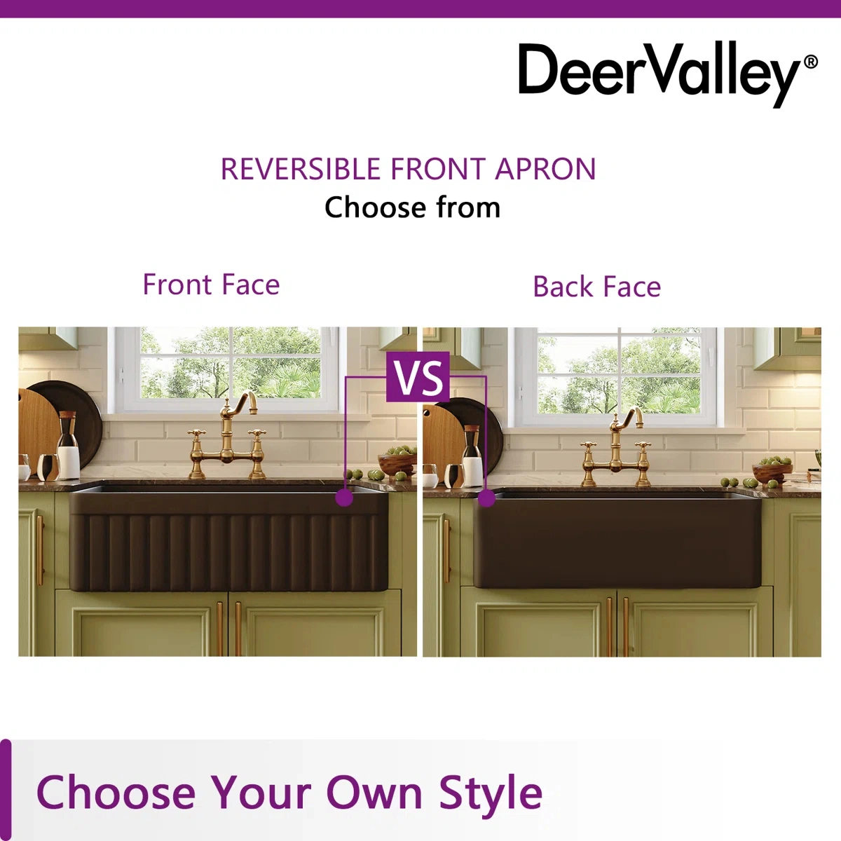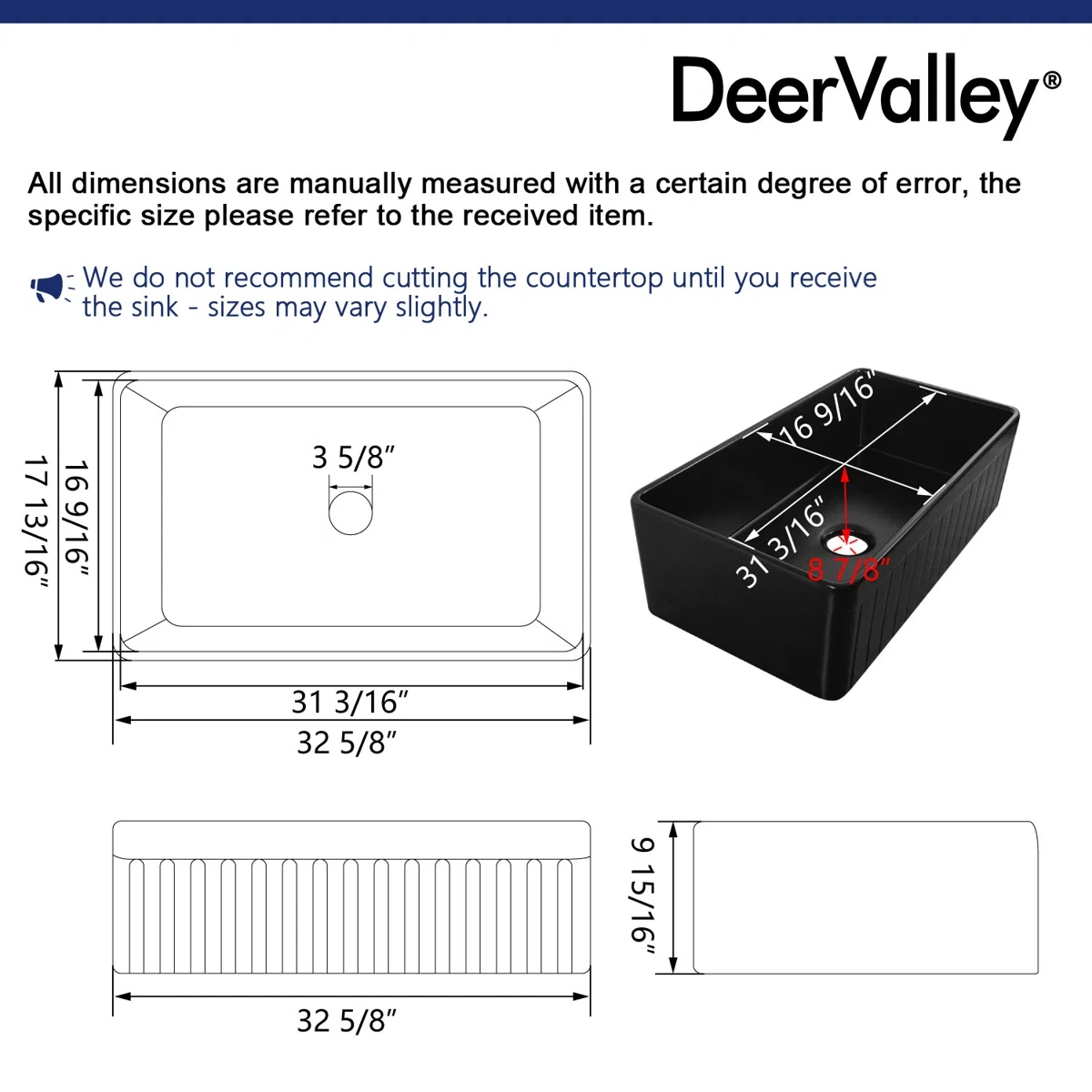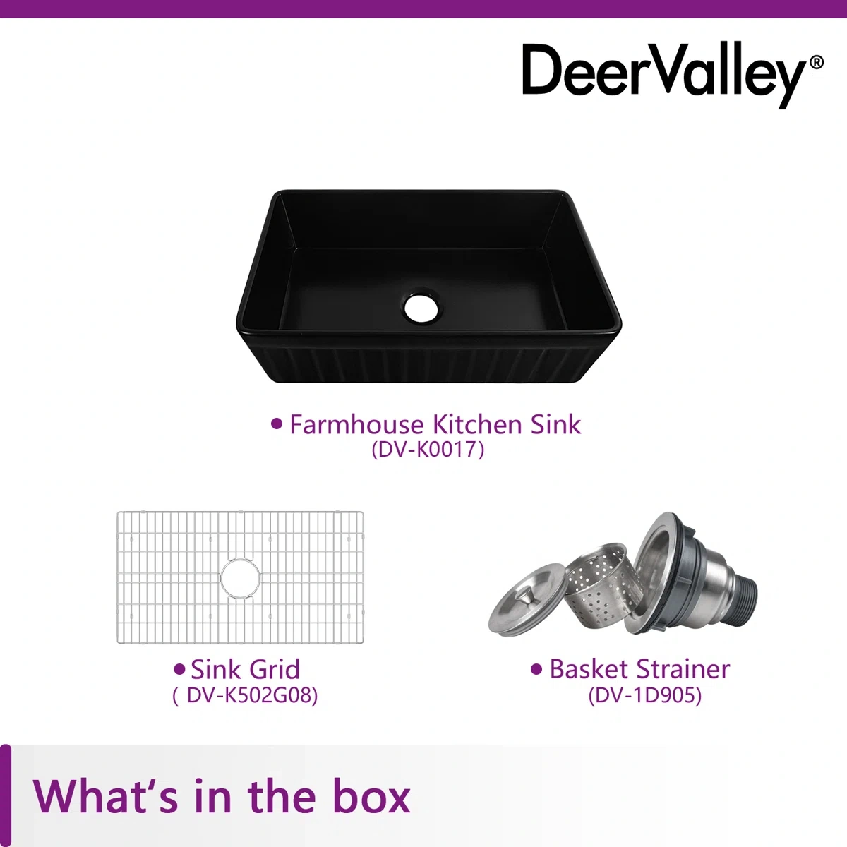 69Solstice 33" L x 18" W Fireclay Farmhouse Kitchen Sink with Sink Grid and Basket Strainer DV-1K0017 brand new in box (BNIB) never used Finish: Matte Black $750+tax new https://www.wayfair.ca/home-improvement/pdp/deervalley-solstice-33-l-x-18-w-fireclay-farmhouse-kitchen-sink-with-sink-grid-and-basket-strainer-drll1110.html?piid=81000769 This DeerValley fireclay farmhouse apron kitchen sink is made with high-temperature firing, which gives it a dense structure and a solid texture. The most significant advantage of the dense structure is its non-porosity, which protects the kitchen sink from the infiltration of water and air, thus making the interior of the farmhouse kitchen sink clean and hygienic and less prone to yellowing. Then the sturdy texture makes the apron kitchen sink resistant to scratches and impacts, ensuring the longevity of this kitchen sink. And this kitchen sink is also equipped with a compatible basket drainer and sink grid, which not only facilitates daily use but also better protects the kitchen sink. What's more, this kitchen sink can be installed on both sides, so you can choose any side to install according to your home decoration style. One side of it is simple and elegant, and the other side is exquisite and romantic, either side can present an excellent visual experience while being practical and beautiful! What's Included? Basin Rack/Bottom Grid Basket Strainer Features The single bowl sink is constructed from fireclay that is fired at 2900°F over 20 hours for extreme strength and durability. Reversible apron sink with a flat apron front can elevates your kitchen decor with modern style, you can choose a flat apron front or fluted apron front depend on your preference. This optimized bottom slope farmhouse sink keeps water easily washed down the drain, not easy to pool and block and prevents fragile glassware from toppling over. Round corners and glossy finish make it easy to clean. Solid farmhouse sink has non-porous, smooth, glossy surface, extremely resistance to chip, discoloration, scratching, cracking and heating. Will be durable non-discolouring and beautiful in several dozen years. Our sinks bowl are 8 7/8" interior deep, which can provide ample space to accommodate many items, even large kitchenware. Fireclay material makes the surface of this kitchen sink smooth and comfortable and also makes it quieter than a stainless steel sink.