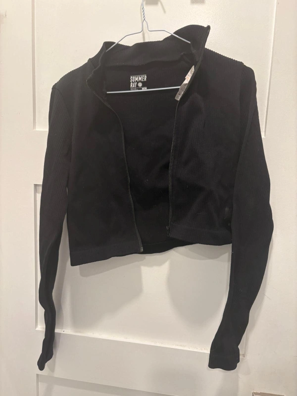612Selling a cute black cropped zip-up jacket from Sommer Ray! It's in great condition and a size medium. Perfect for layering or wearing on its own. The material is soft and comfortable, making it ideal for everyday wear