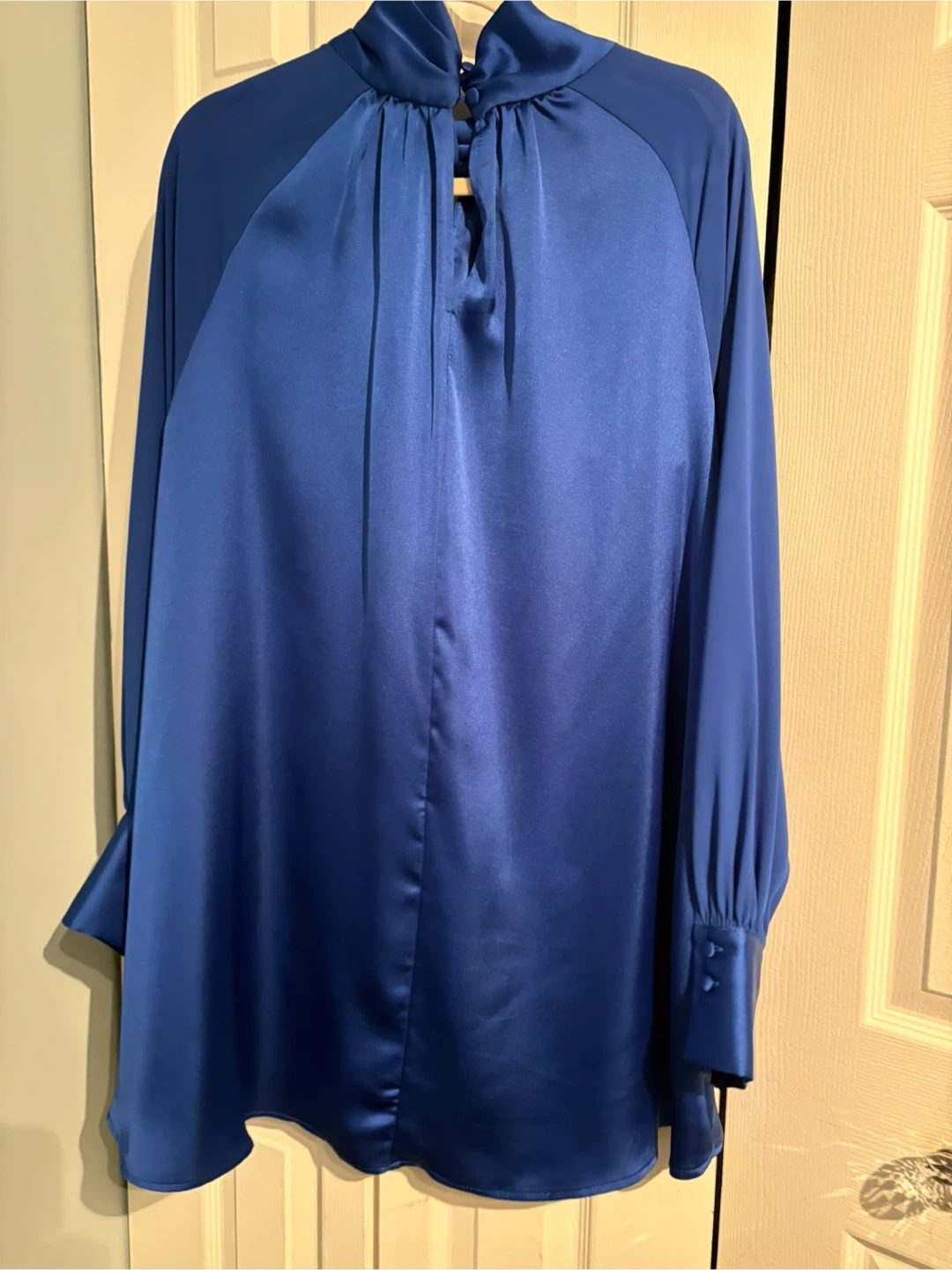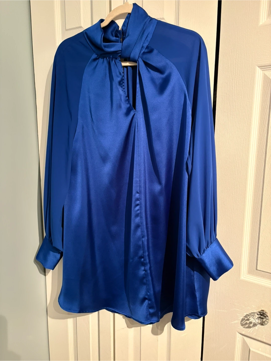 This is a long-sleeved royal blue mini dressIt features a high neckline with a keyhole detail and satin fabric. The sleeves have buttoned cuffs.