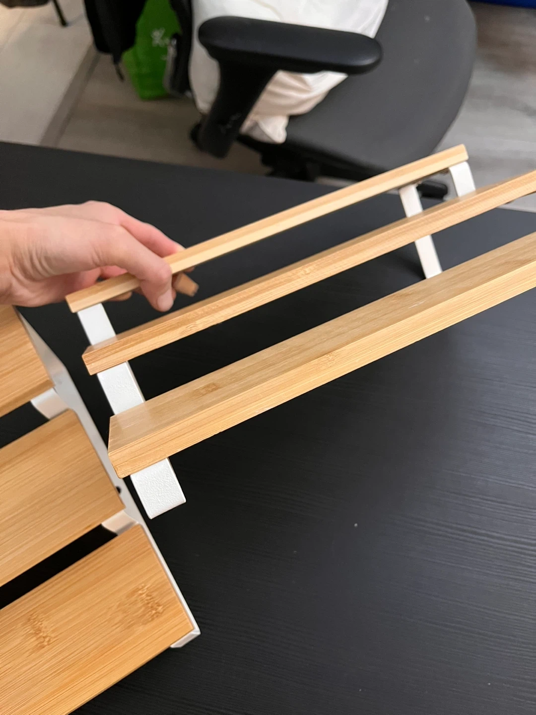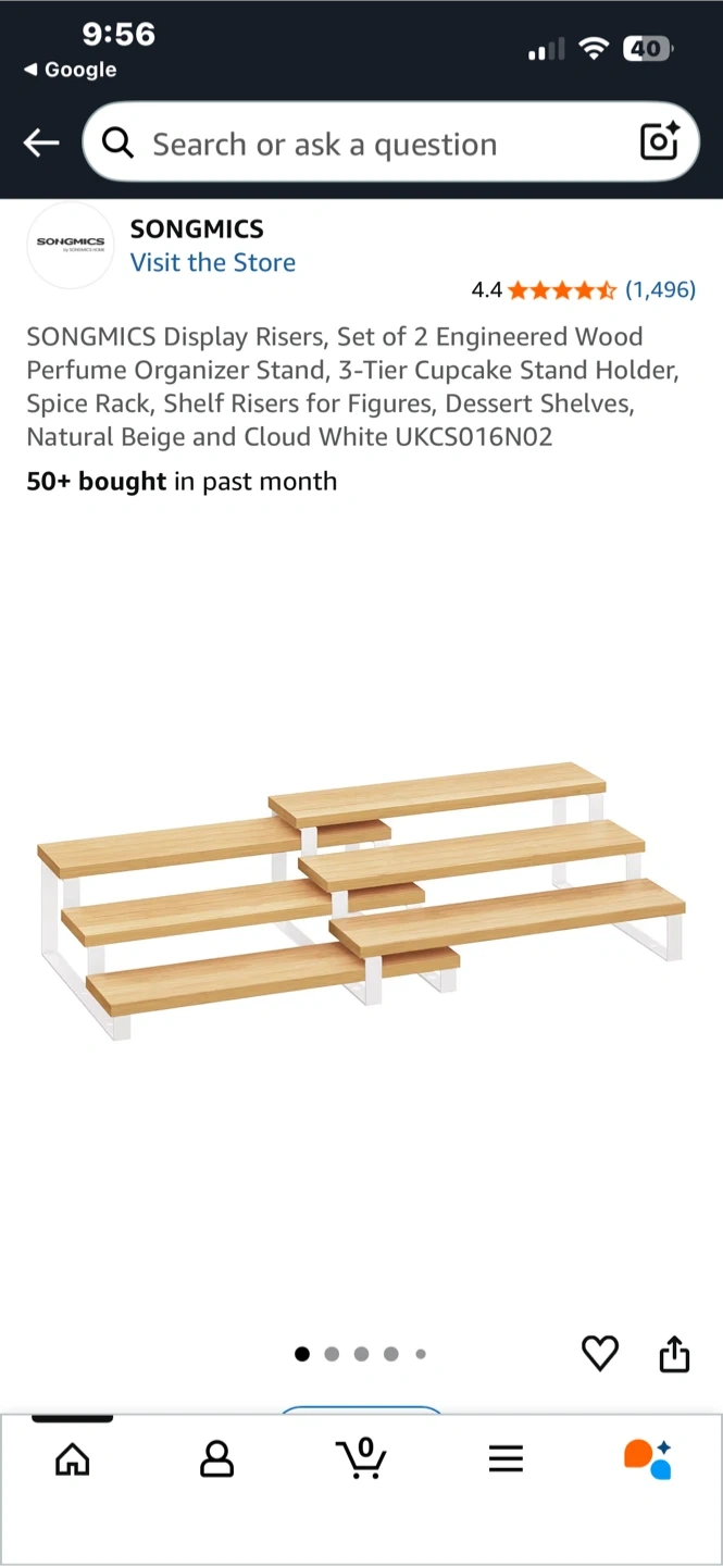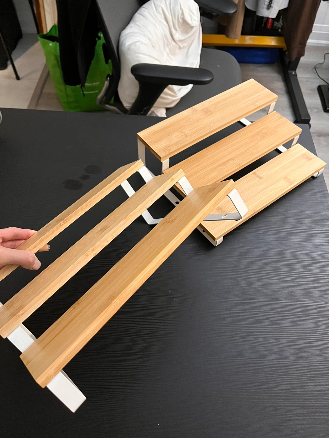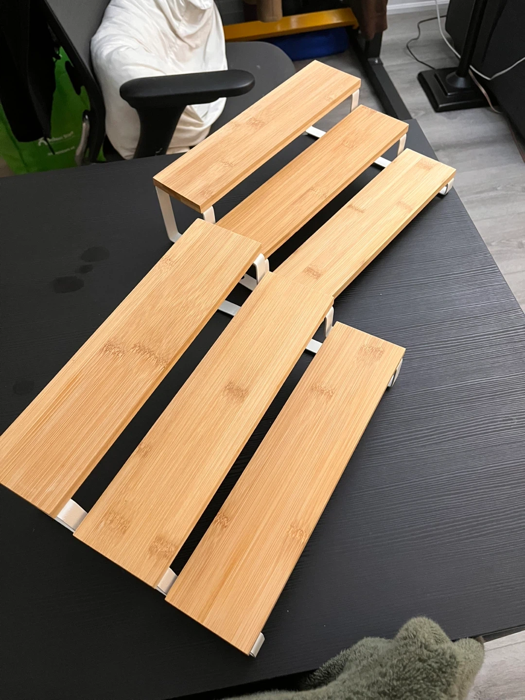 57Selling a set of SONGMICS display risers! These are great for organizing perfume, spices, or figures. They can also be used as dessert shelves or shelf risers. They are made of engineered wood with a natural beige and cloud white finish. Get organized with these versatile risers! Selling because my kitchen space is small and no space for these