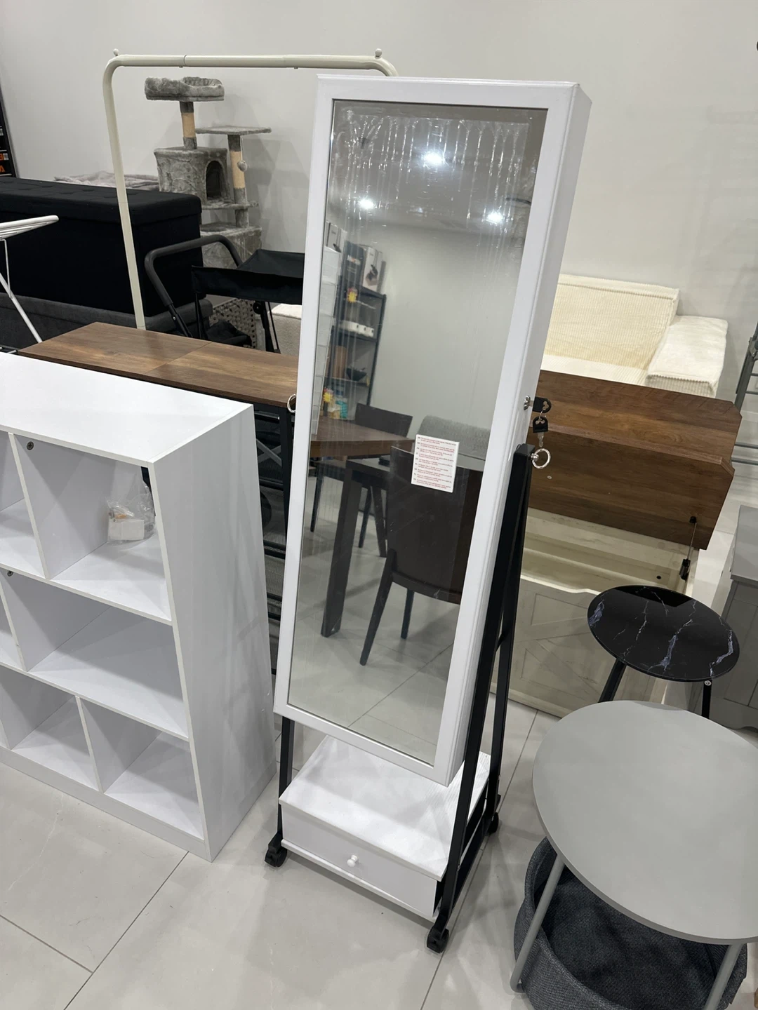 Selling a SONGMICS jewelry cabinet with a built-in mirror. It's in great shape and ready to organize all your accessories! The cabinet is white and features a sleek design that will look great in any room