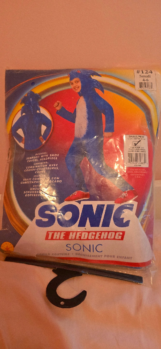 10Selling a Sonic the Hedgehog child's costume! This is a size small 4-6 and includes the jumpsuit with shoe covers and a headpiece. Perfect for Halloween or dress-up!