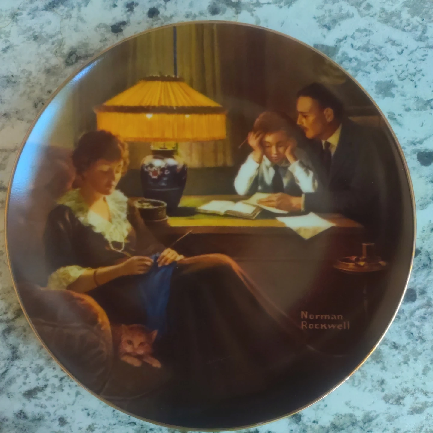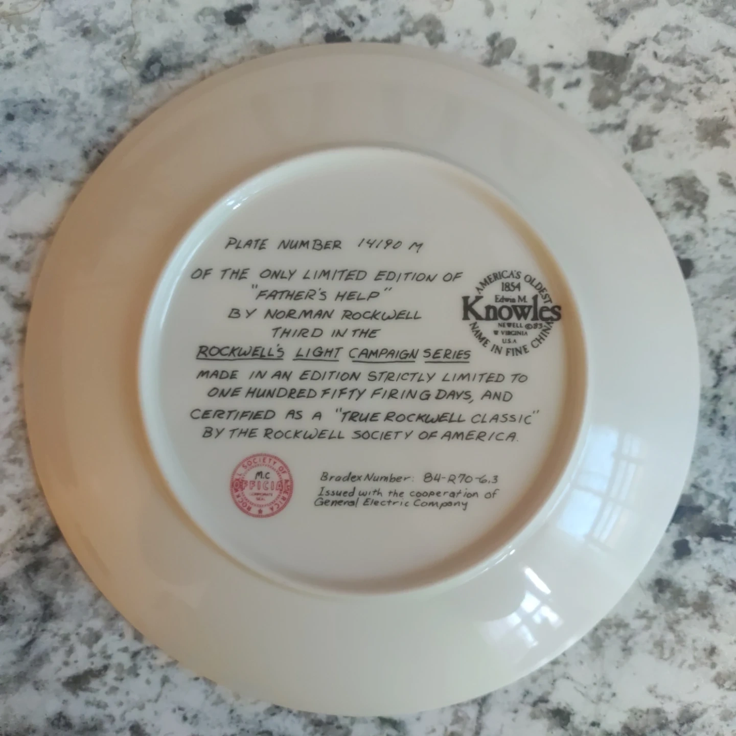 This is the "Father's Help" collector plate by Norman Rockwell, third in the Rockwell's Light Campaign Series. It's part of a strictly limited edition of one hundred fifty firing days. Certified as a "True Rockwell Classic" by the Rockwell Society of America. This plate was issued with the cooperation of General Electric Company. Made by America's Oldest Name in Fine China, Knowles.
