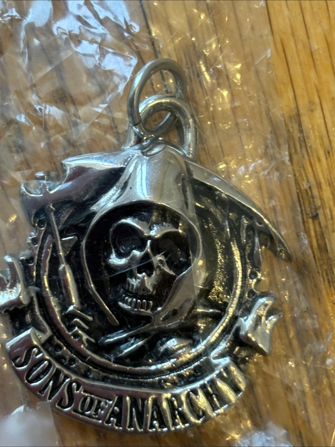 Metal pendant featuring a grim reaper design. Sons of Anarchy logo. Nice detail. Great for collectors.