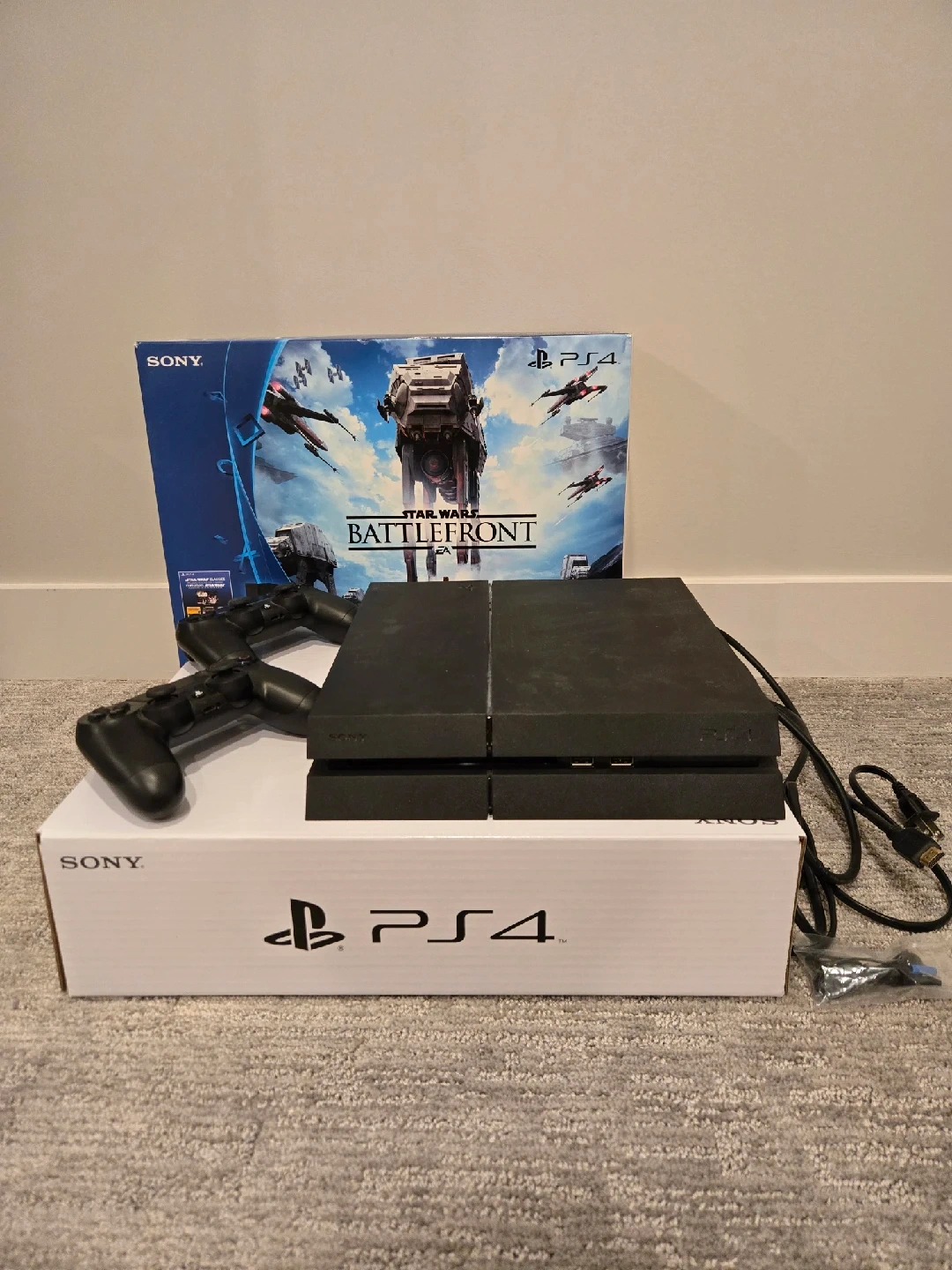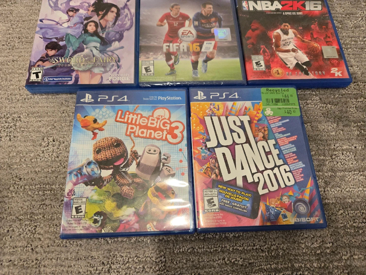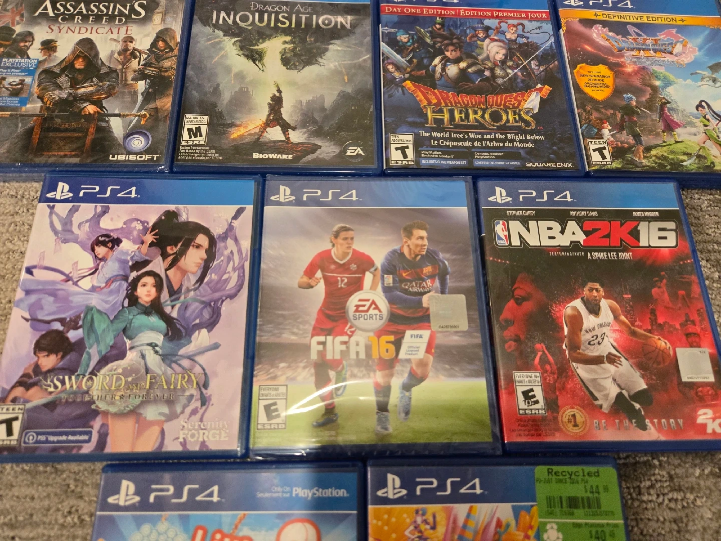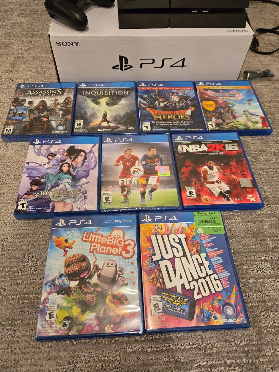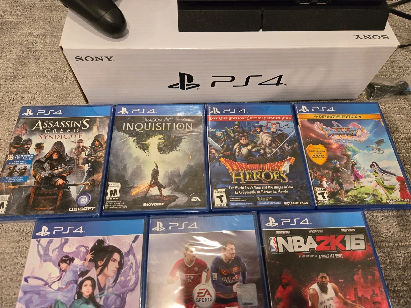 38Selling a used PlayStation 4 with a variety of games. Includes the console, two controllers, and several popular titles like Assassin's Creed, Dragon Age: Inquisition, FIFA 16, and more. The console comes with its original box. $200 for everything. PS4 and all the gams (there are 2 brand new games). *please check my other active listing.