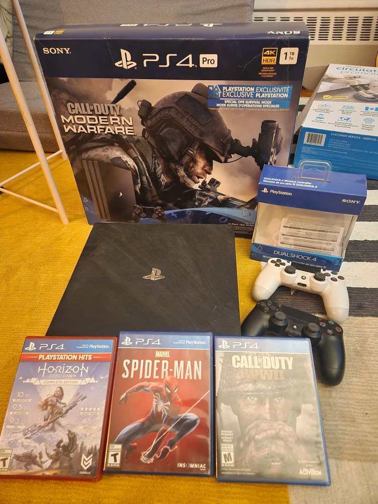 15Selling a Sony PS4 Pro with 1TB storage. Includes the Call of Duty Modern Warfare game in the box. Also comes with Dualshock 4 controller and the following games: Horizon Zero Dawn, Spider-Man, and Call of Duty WWII