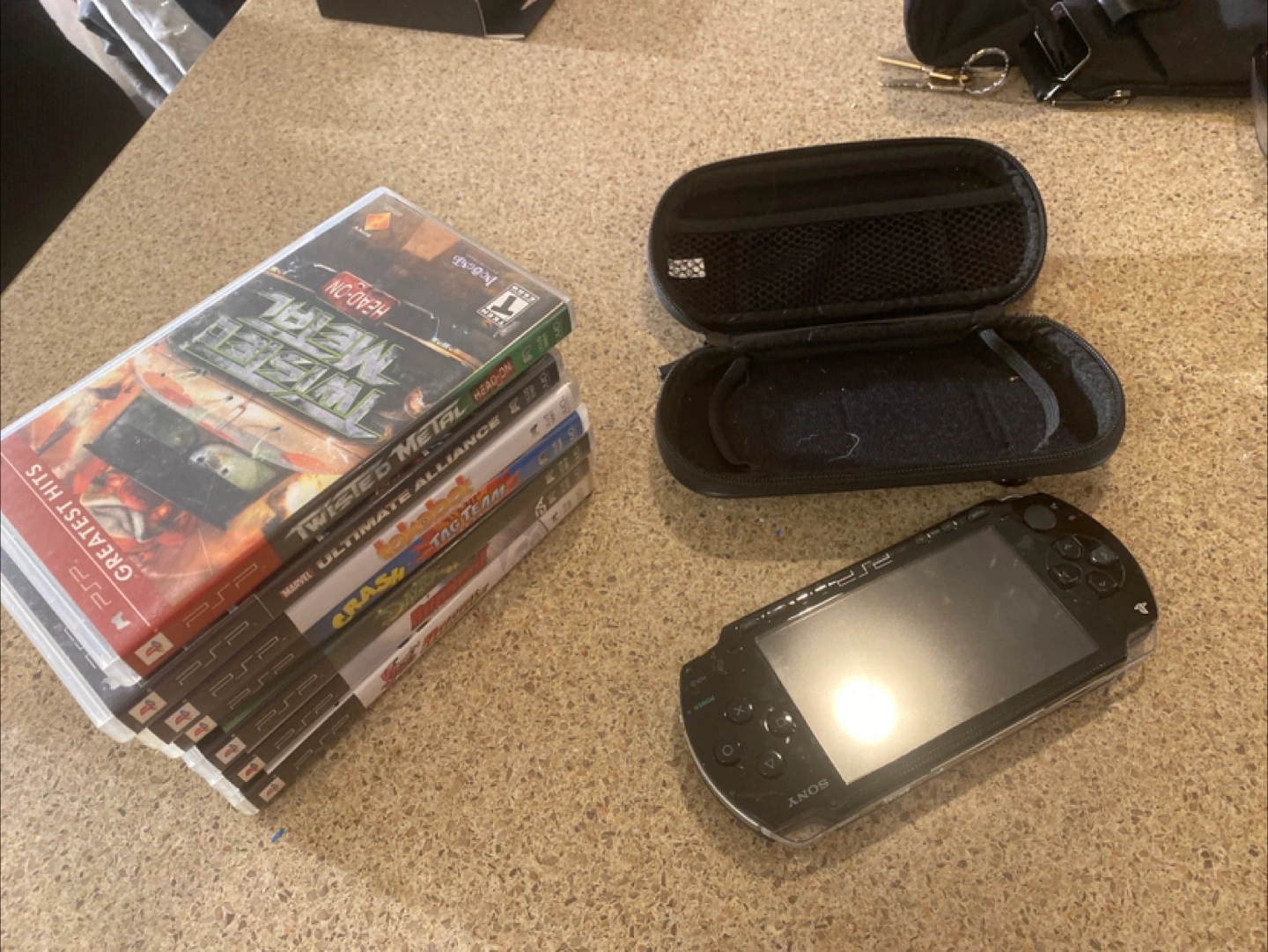 78Selling a black Sony PSP handheld console. It comes with a carrying case and several games, including Twisted Metal and Crash. Great for on-the-go gaming!