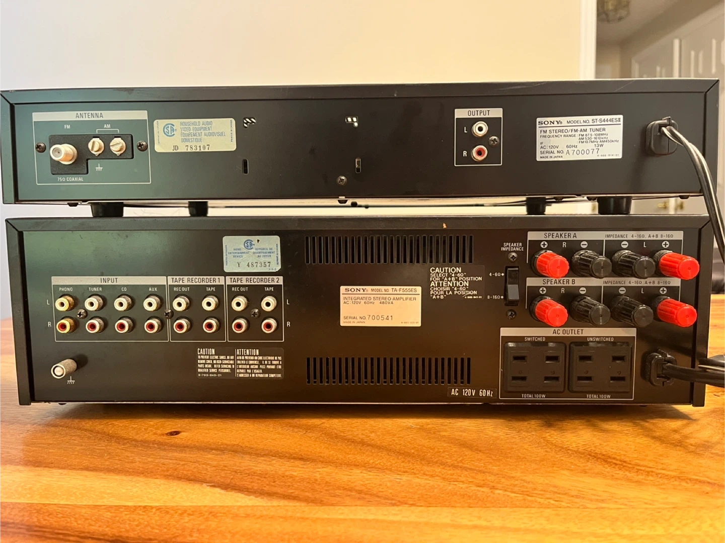 20Selling a Sony ST-S444ESII FM stereo/FM-AM tuner along with a Sony TA-F555ES integrated stereo amplifier. Both units are in good working condition and ready to enhance your audio setup. The tuner features a direct comparator and quartz lock digital synthesizer. The amplifier includes an audio current transfer system.