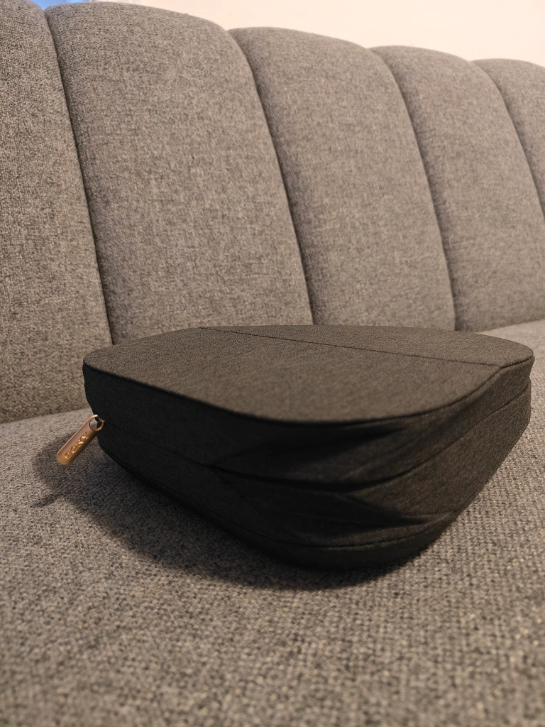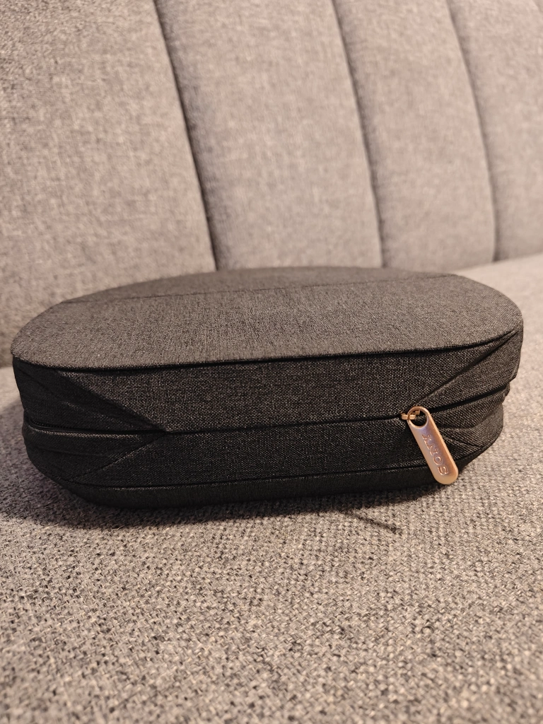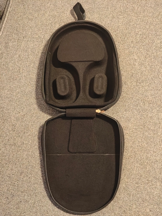 5Selling a black headphones carrying case. It has a zipper closure and a handle for easy carrying. The inside is lined with a soft material to protect your headphones. Comes with a small pouch for cables and accessories