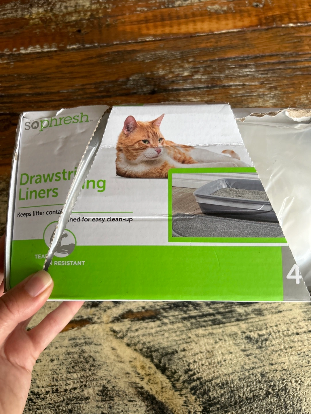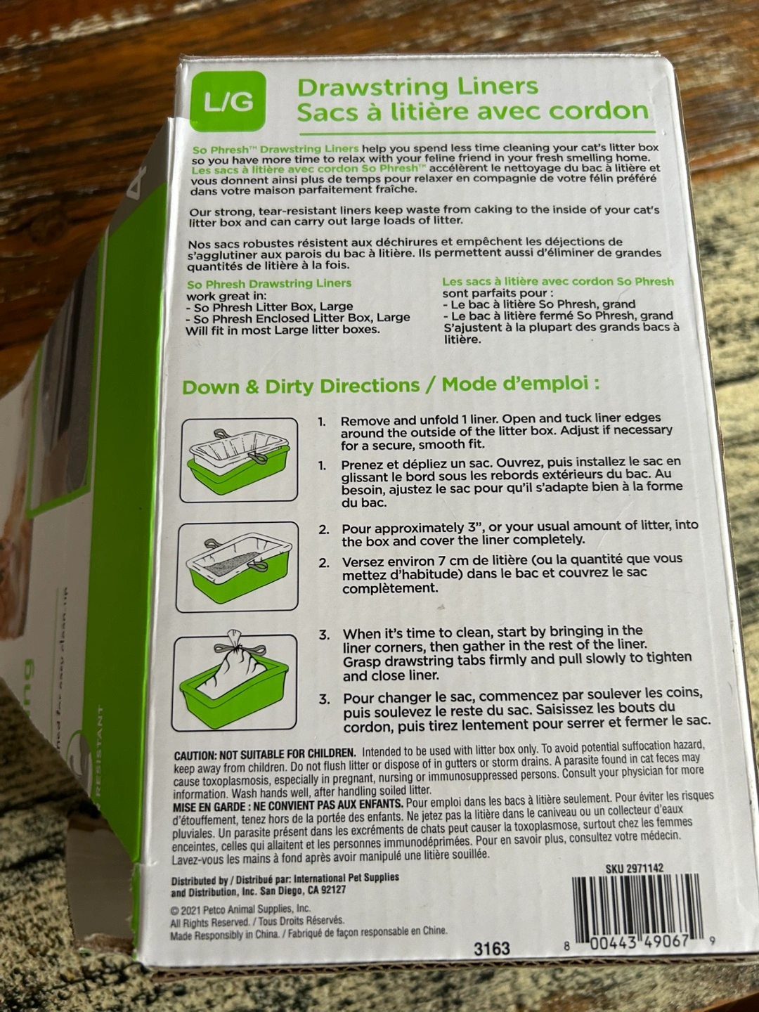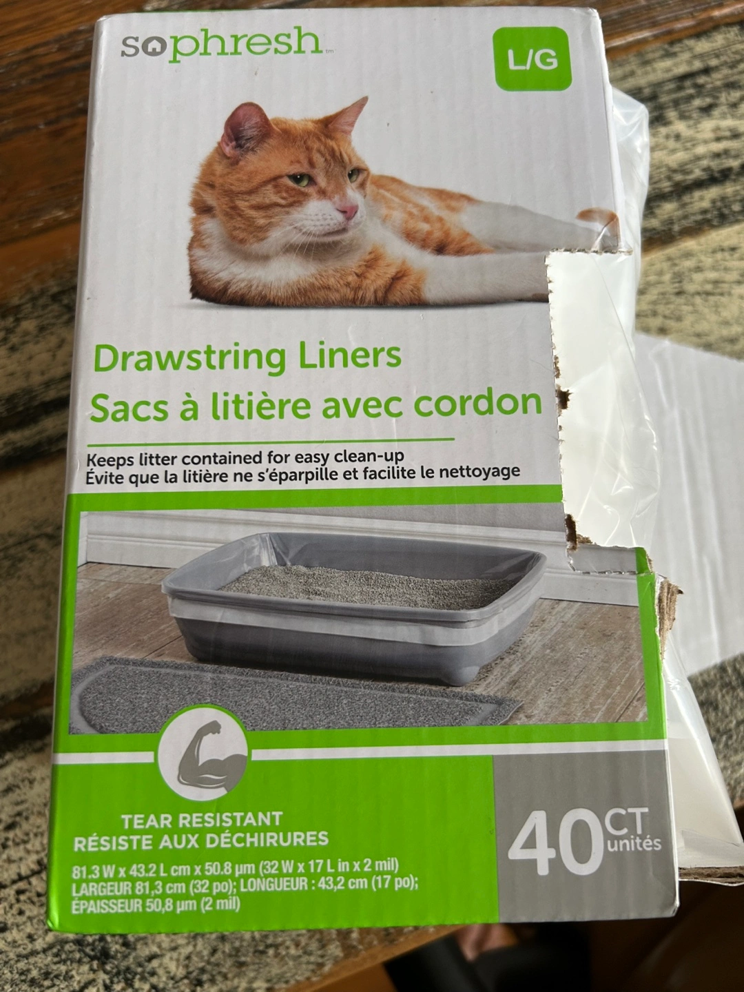 Selling a box of Sophresh Drawstring Liners for cat litter boxes. The box contains 40 liners and is in L/G size. They are tear-resistant and help keep the litter contained for easy clean-up. Comes with the box. Box was opened but no liners were used.