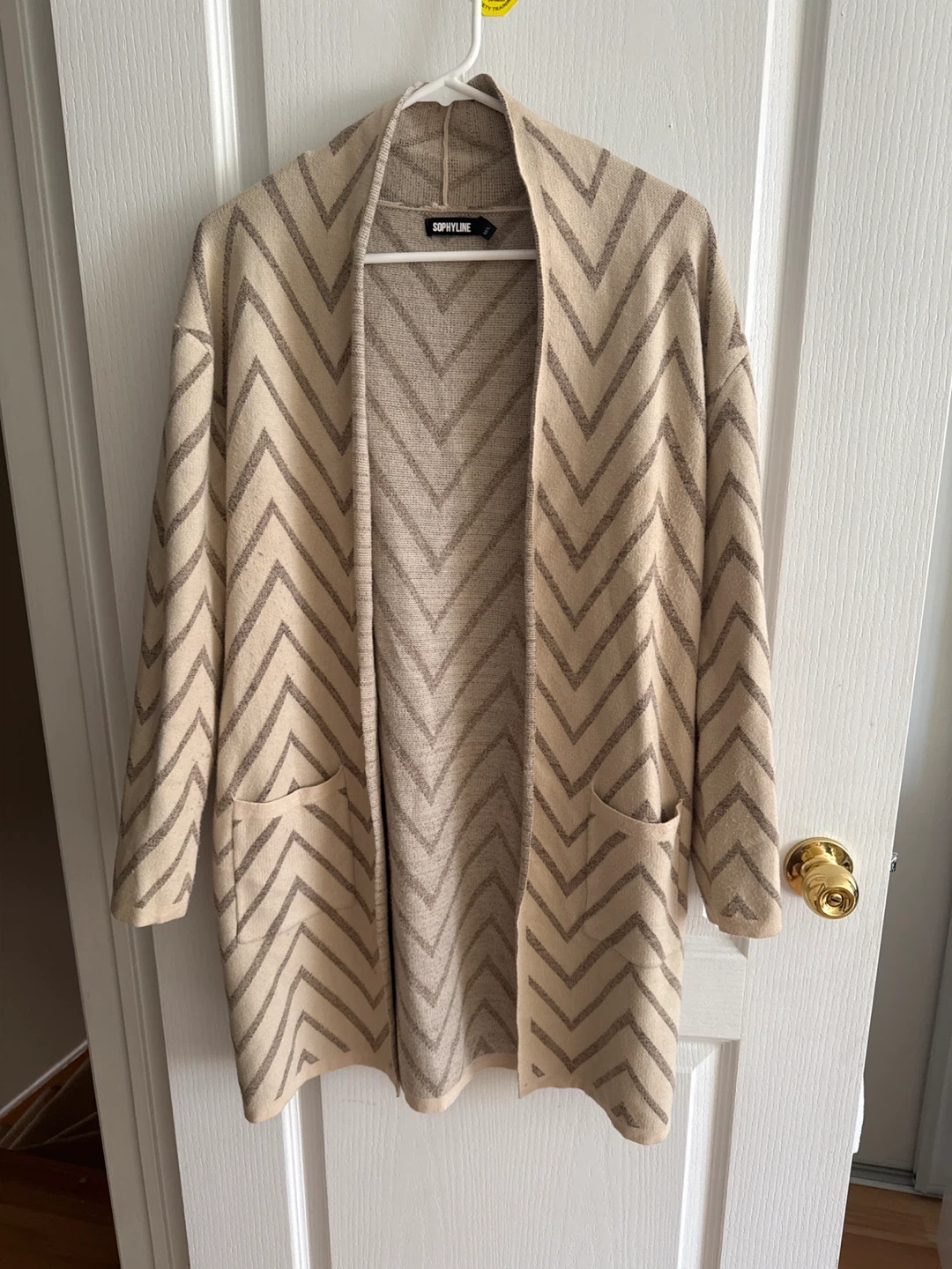 10Cozy Sophyline cardigan featuring a stylish beige chevron pattern. It's perfect for layering and adding a touch of flair to any outfit. The cardigan is in great condition and ready for a new home!